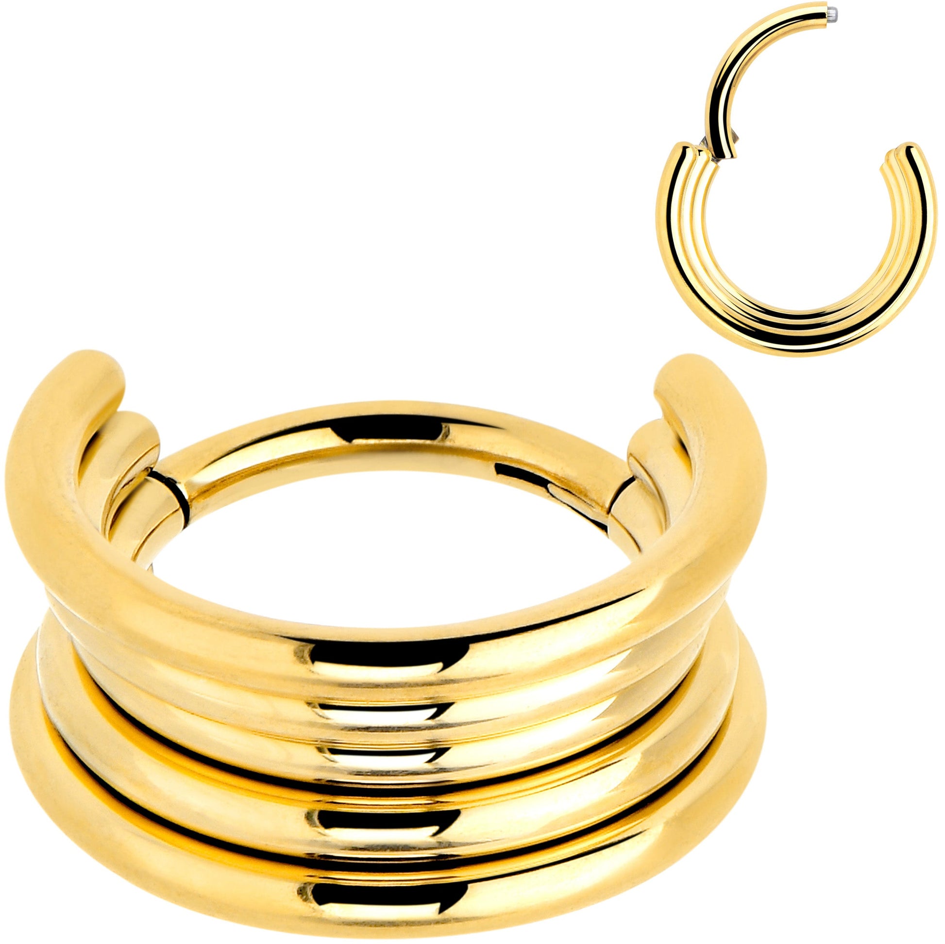 Get style that's stacked without the stretch with this 16 gauge septum ring. It is made with an 8mm ASTM F-136 titanium hinged circular ring. It features multiple rows of parallel curve for a look that appears like stacked jewelry but doesn't require a stretched piercing.