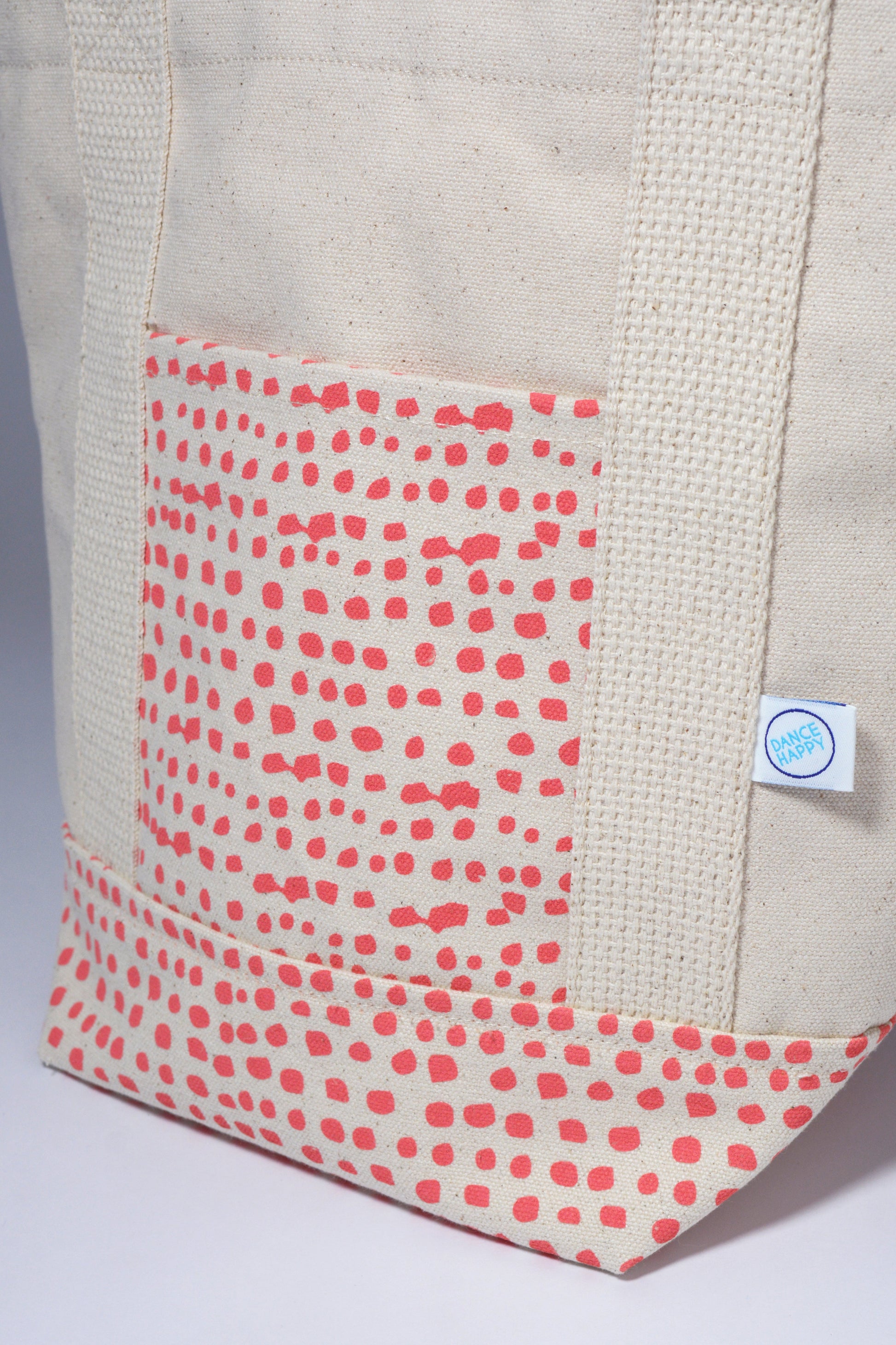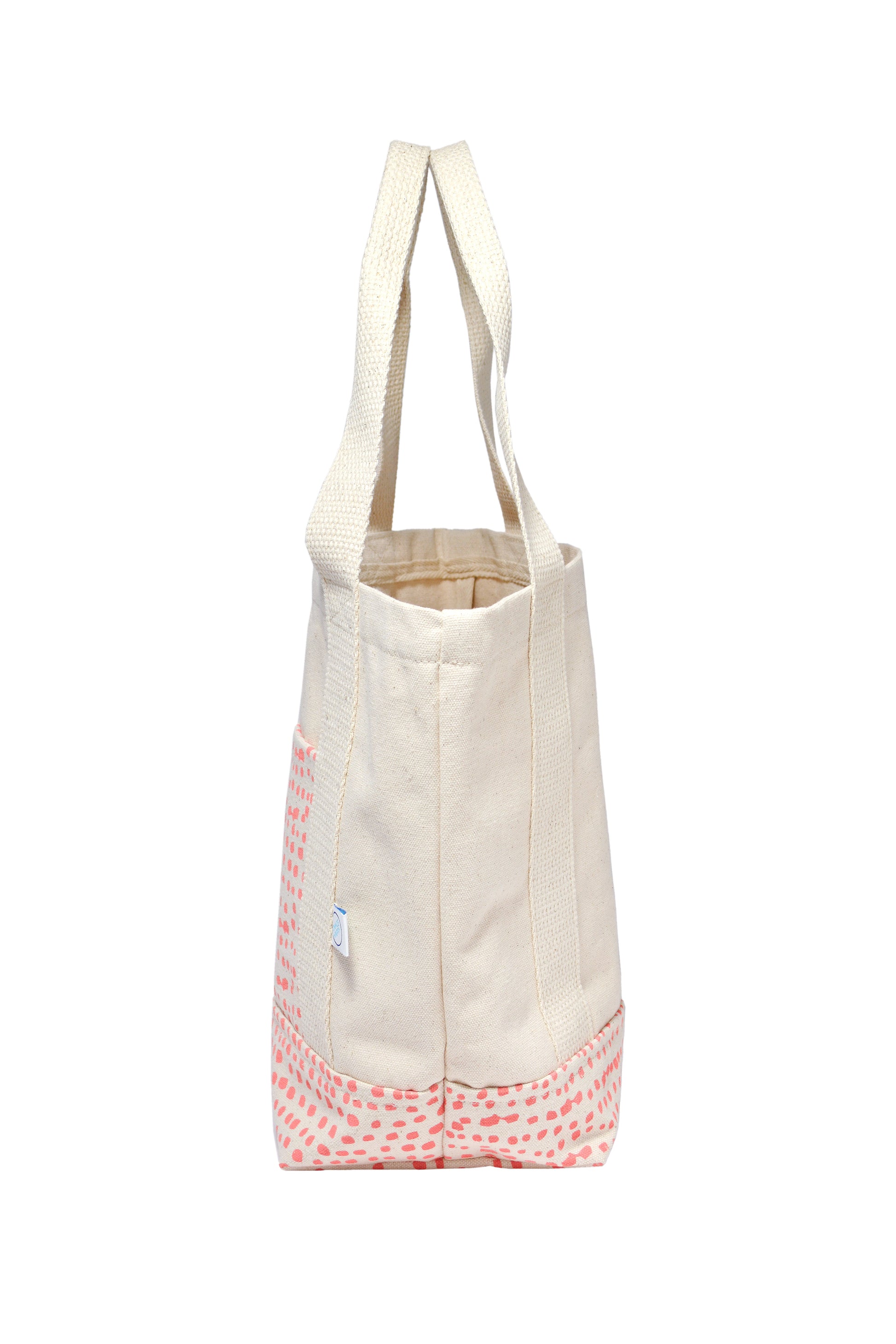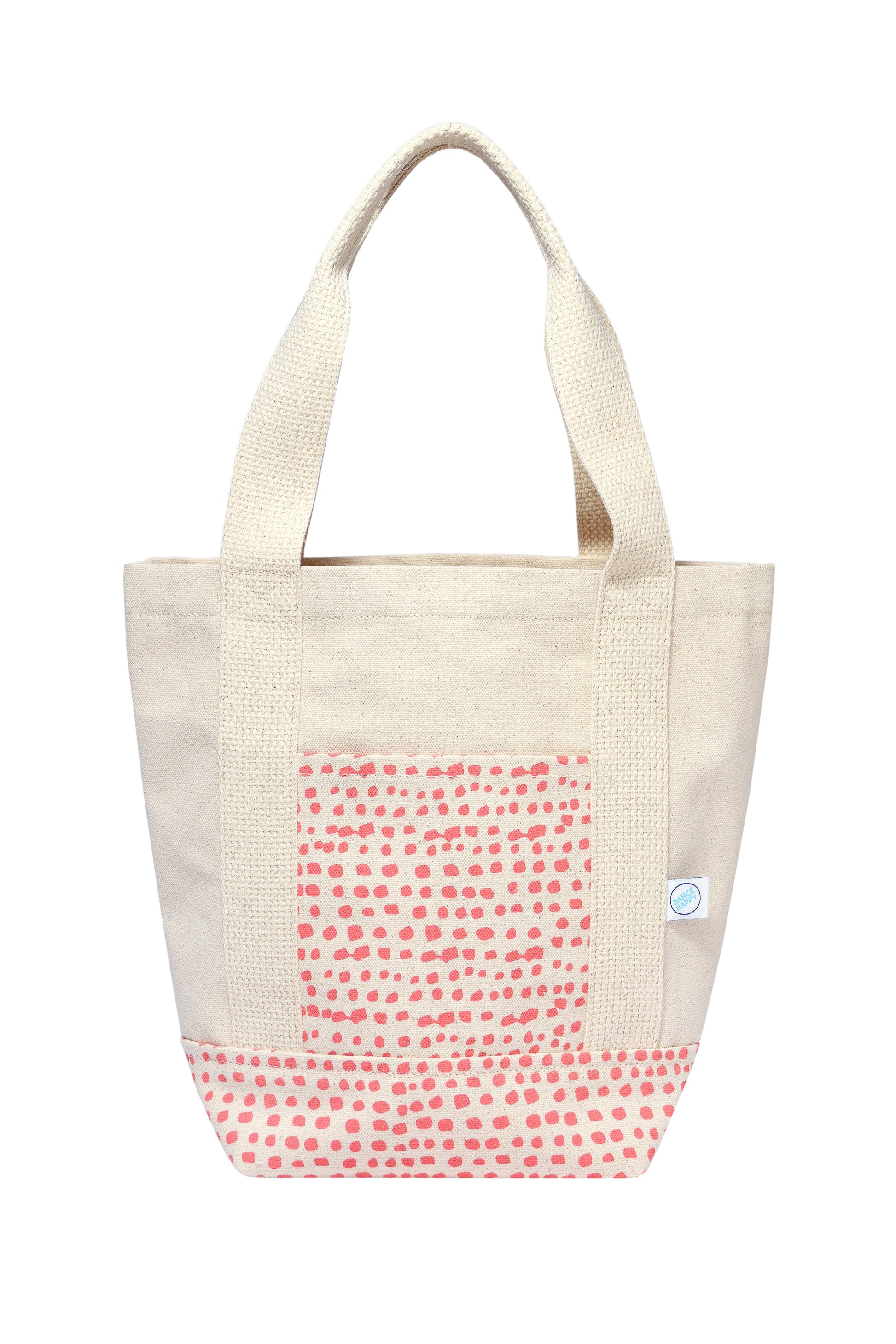Sized at 12.5" wide by 11" tall with a 6" gusset and a 7.5" handle drop, this mini tote bag fits just right—never bulky, always ready. Made from 100% cotton canvas, it features a hand painted dot pattern that's screenprinted in coral.