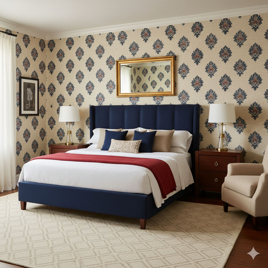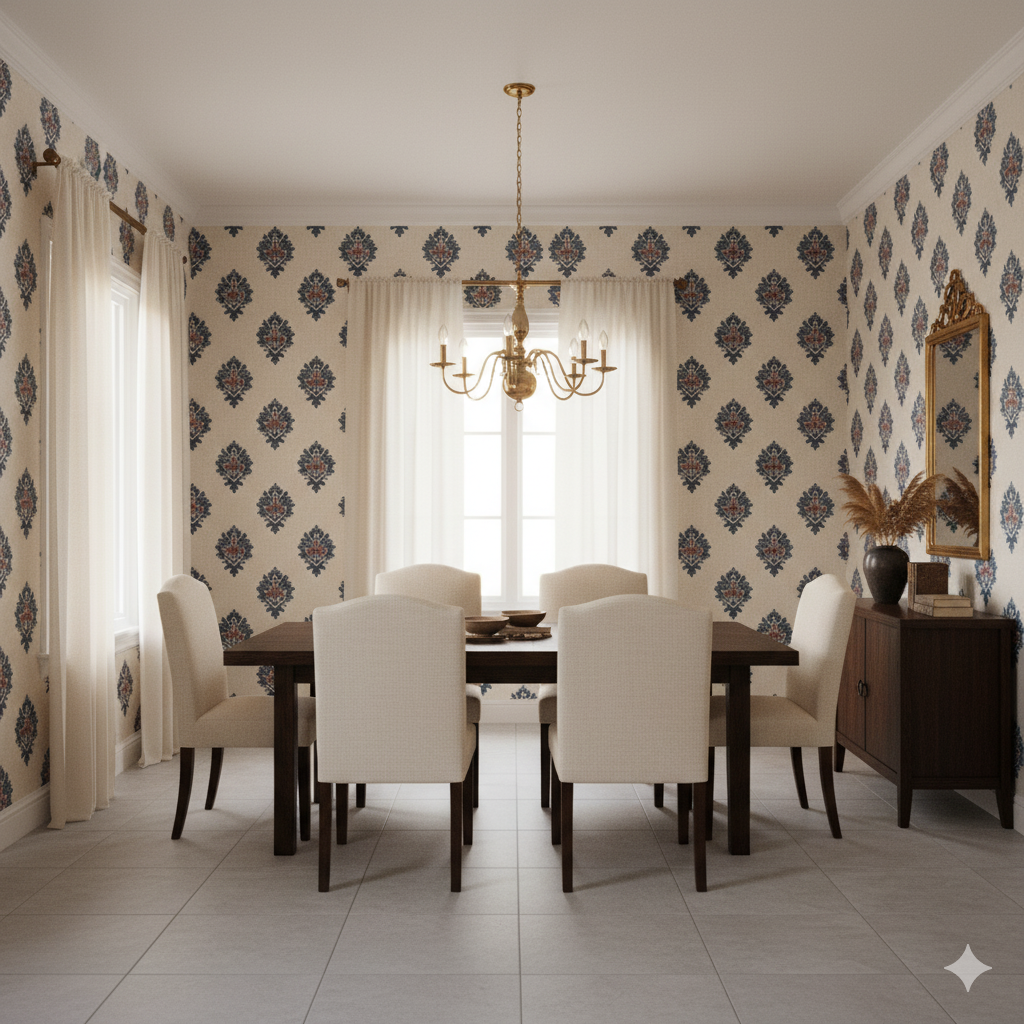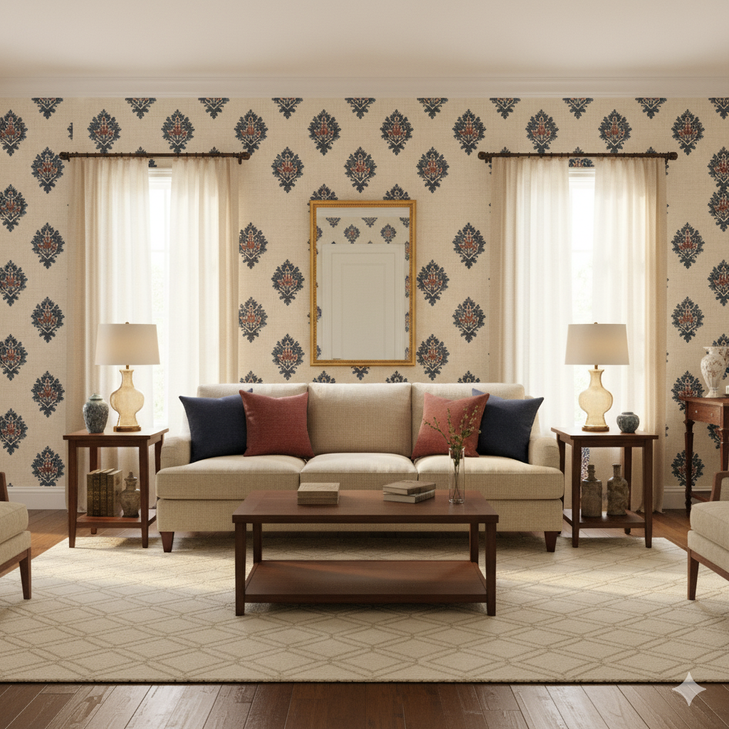 Here, a stylized floral motif in deep indigo and earthy rust repeats across a soft ivory ground, evoking the character of heritage textiles reinterpreted for modern interiors. The design has a slightly weathered, woven quality, as though stamped or block-printed by hand. It bridges global bohemian aesthetics with refined European country charm, making it versatile for dining rooms, cozy reading nooks, or boutique hospitality spaces. The interplay of blue and red grounds it in a classic palette, while the imperfect edges ensure it avoids feeling too formal. It is elegance with the soul of the handmade.