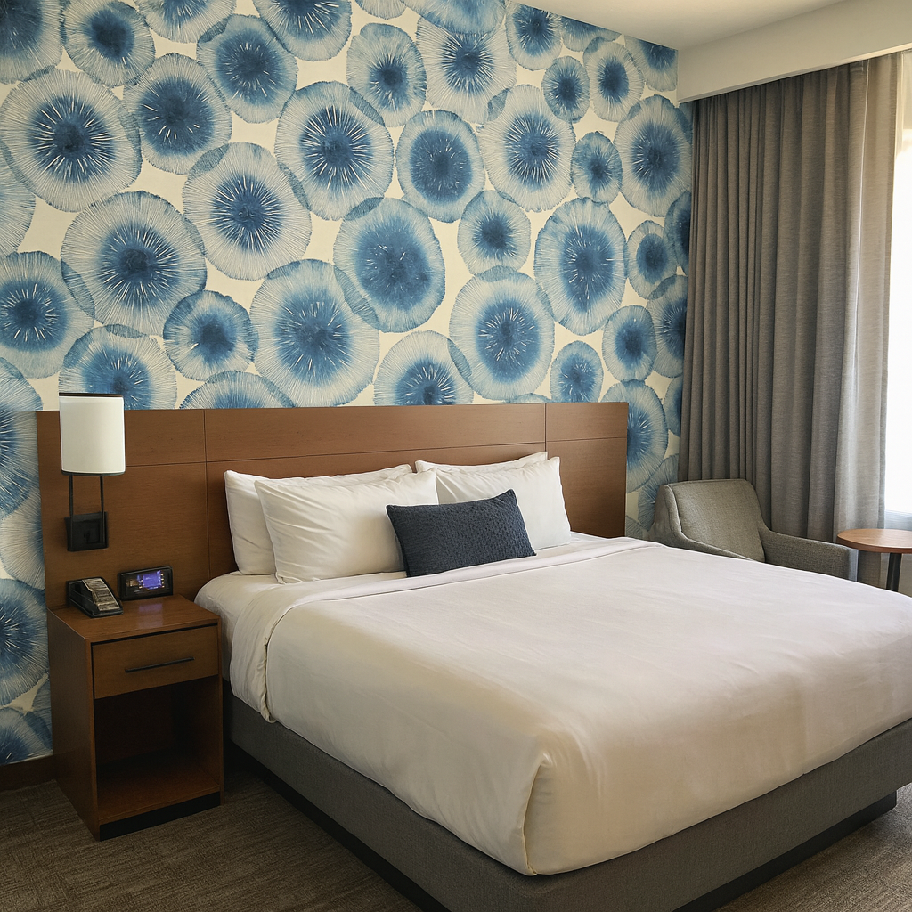 Indigo Fungi Bloom is a mesmerizing display of watercolor-style mushroom gills or sea anemone-like bursts in rich indigo and denim blue. With radiating fine lines and irregular organic shapes, it brings a modern botanical twist to walls. Ideal for accent walls in creative spaces, modern bathrooms, or nature-inspired interiors seeking an artistic and slightly mystical vibe.