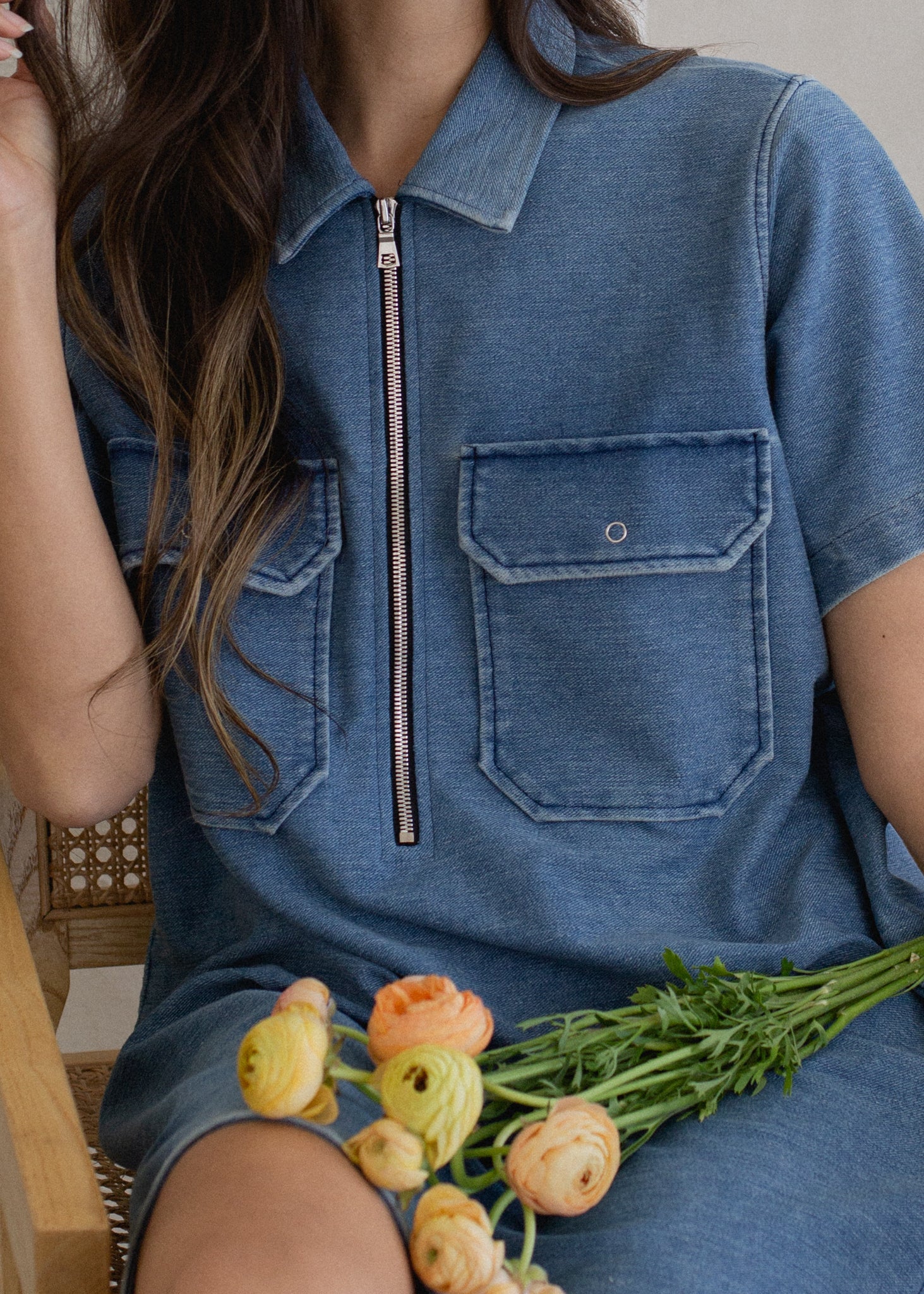 An easy, everyday shirt dress. Unzip completely and pair with a bralette underneath to show some skin or wear zipped up for a more preppy look. Perfect to throw on for a picnic or brunch.