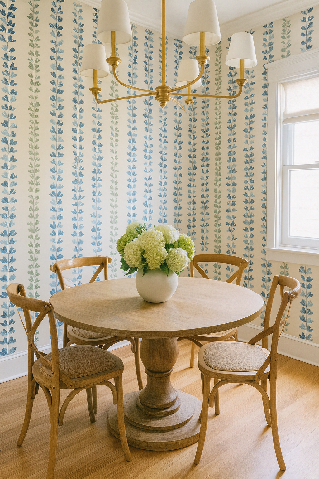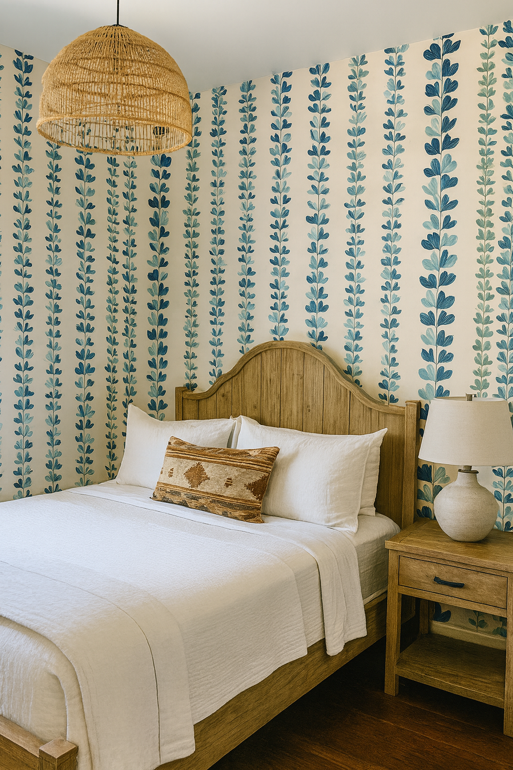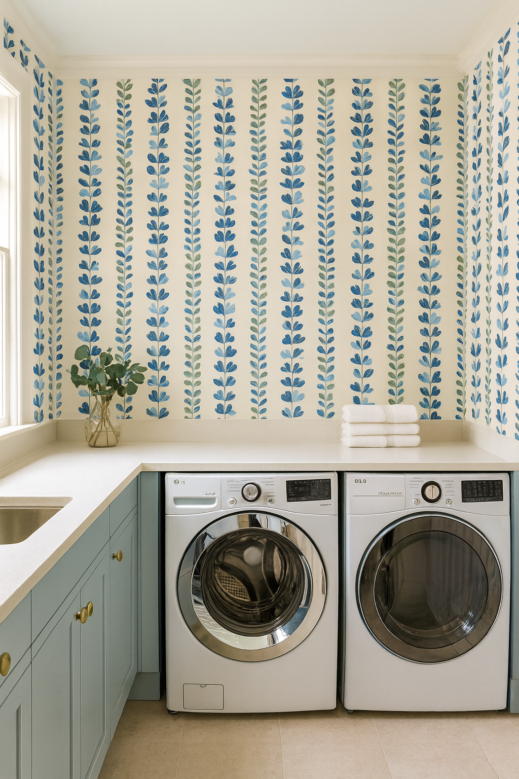 “Indigo Vine Parade” is a vertical botanical march of stylized Baptisia (wild indigo) leaves and pods. The repeating leafy columns alternate between shades of deep navy, soft sky blue, and muted green over an ivory backdrop. The verticality adds height and rhythm to any room. Ideal for powder rooms, laundry spaces, or cheerful breakfast nooks, this pattern brings fresh, modern botanicals into traditional and coastal-inspired interiors alike.