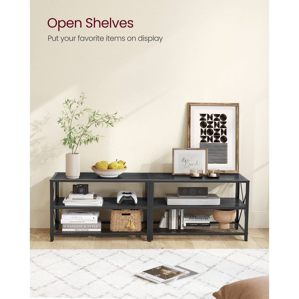 Round up several friends and raise your TV (up to 70 inches) with this Industrial Black Metal Wood TV Stand Entertainment Center for TV up to 70-inch sized at 63”L x 15.4”W x 20.5”H to get ready for a movie marathon. This TV console comes with three shelves to display your photo frames and trinkets, or store your DVDs, game console, books and more. Crafted with 6 robust steel legs and quality particleboard, reinforced with X-shaped bars, and equipped with adjustable feet, this sturdy TV table offers stable and reliable support. Black boards with wood grain soften the coolness of the black steel frame in this TV cabinet to set a warm tone and create a charming ambiance for entertainment moments. No need to worry about the assembly. The simple structure, numbered parts, and clear instructions will help you assemble this TV stand easily.