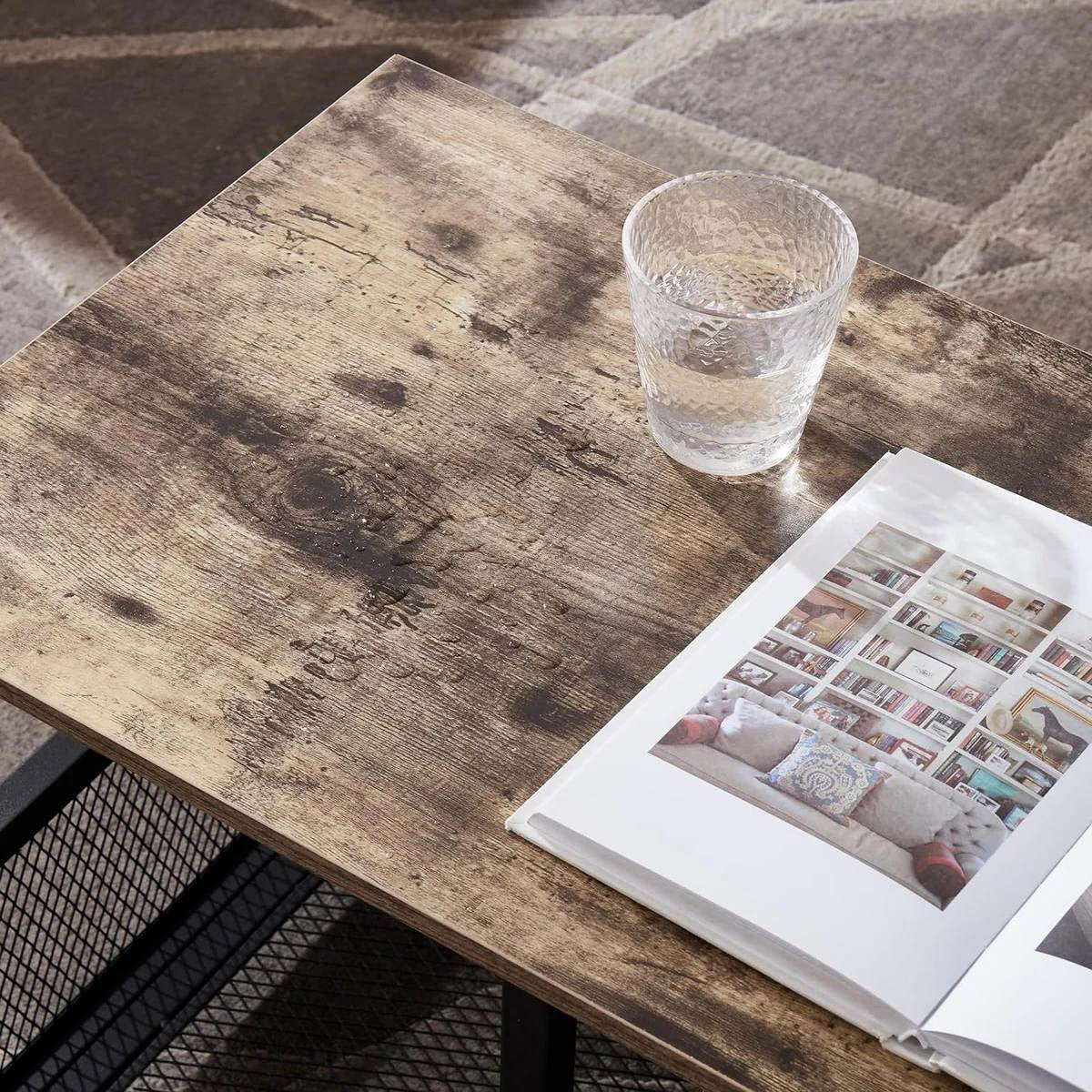 This Industrial Modern Black Metal Grey Wood TV Stand with Media Storage Shelf features retro finish wood grain and black metal frames to create a warm and inviting vibe, which can easily match any living room decor. Adding novelties to your home.Dimensions: 39.37"(L) x 15.7"(W) x 17.7"(H). TV stand constructed of quality particle board shelves and industrial mesh shelves, top surface supports up to 130 lbs. and mesh shelves support up to 44 lbs. The adjustable foot pad ensures it is more stable on an unbalanced floor. Featuring a spacious tabletop for accommodating TVs 25-50 inches, and 2 tiers of open storage shelves for your DVDs, a loudspeaker, remote controls, magazine, or anything you like, this tv stand make your room organized. This TV table can be used on many occasions, such as in the living room, bedroom, office, and so on. Not only used as a TV stand but also as a coffee table. Easy to clean with a wet cloth. All the parts are clearly labeled, the instructions are very easy to follow, and you can finish the assembly in 30 minutes.