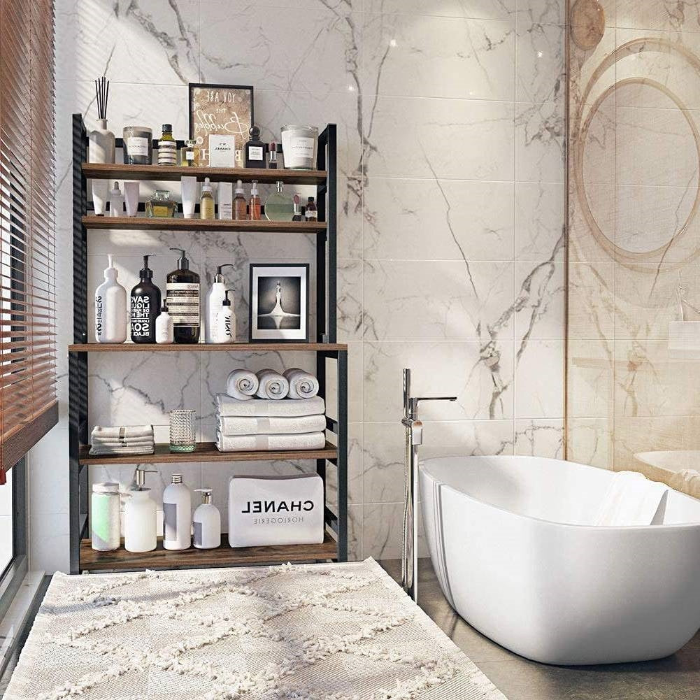 This Industrial Modern Kitchen Bakers Rack Brown Woodgrain Sturdy Metal Frame has high on utility, not only a kitchen island, also as an elegant bookcase, microwave stand, spice rack organizer, bathroom cabinet, wine board for living room, and can harmonize with any other rustic furniture in any room. The vertical structures doesn’t take up space and add more storage space for bedroom, kitchen, pantry or bathroom. Come with a total of 3 bottom shelves and 2 top shelves, this microwave rack is an excellent storage option for the eat-in kitchen. It is ideal for holding a microwave, oven, and some of your other kitchenware or bits and pieces, as well as storing spice, plate dishes, and any other things you want. Your kitchen will become tidy! This kitchen stand features a 31.5”L x 15.7”D tabletop to provide a sturdy working surface, which is durable and easy to clean. Two slatted upper shelves are ideal for displaying your favorite cookbooks, jars of spices, and canisters of dry goods. A strong iron frame and quality 0.59” thick chipboard enhance the strength, so you can put all you need on this baker rack. 6 reinforced iron rods of each tier prevent items from slipping and increase the loading capacity. Floor levelers not only can be used in uneven ground to prevent scratches, but also make adjustment of height to meet your various demands.