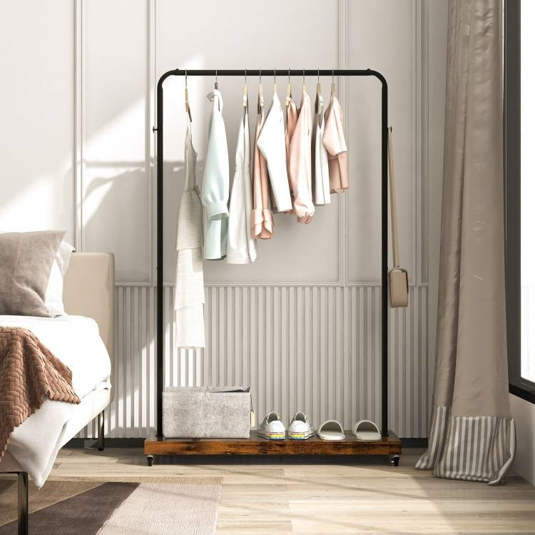 This Industrial Style Heavy Duty Metal Pipe Clothes Garment Rack with Bottom Shelf would be a great addition to your home. Say No to Clutters or Wrinkles: Featuring a 33.5" long hanging rod for clothes, the garment rack serves as a good clothes organizer with enough hanging area, thus to save you time on ironing out wrinkles. Besides, there are 2 additional hanging round hooks for bags or scarves. Multifunctional Design: With 5 S-shaped hooks for hanging plants, the 2-in-1 hanging rack can not only serve as a clothes rack, but also a plant stand. The 5 removable hooks can be flexibly arranged as you like, and you can use them separately for other purposes. Strong Load Bearing Capacity: Thanks to the heavy-duty painted metal pipes, the hanging rod holds up to 88 lbs. And the 1.6" thickened board makes the bottom shelf hold up to 66 lbs. Thus, the clothes rack can meet your needs. 360° Flexible Movement: Fitted with 2 universal casters and 2 lockable casters, the clothes organizer moves easily and brings convenient storage space anywhere you need in home, studio or retail store. You can stop it by stepping on the brakes! Humanized Design: The sturdy and practical bottom shelf offers ample space for shoes and storage baskets. It also helps enhance the stability of the rolling garment rack. What's more, the 2 anti-slip buckles at both ends prevent hangers from falling.