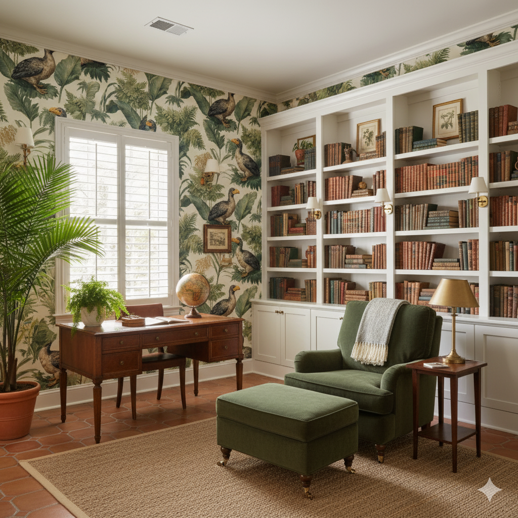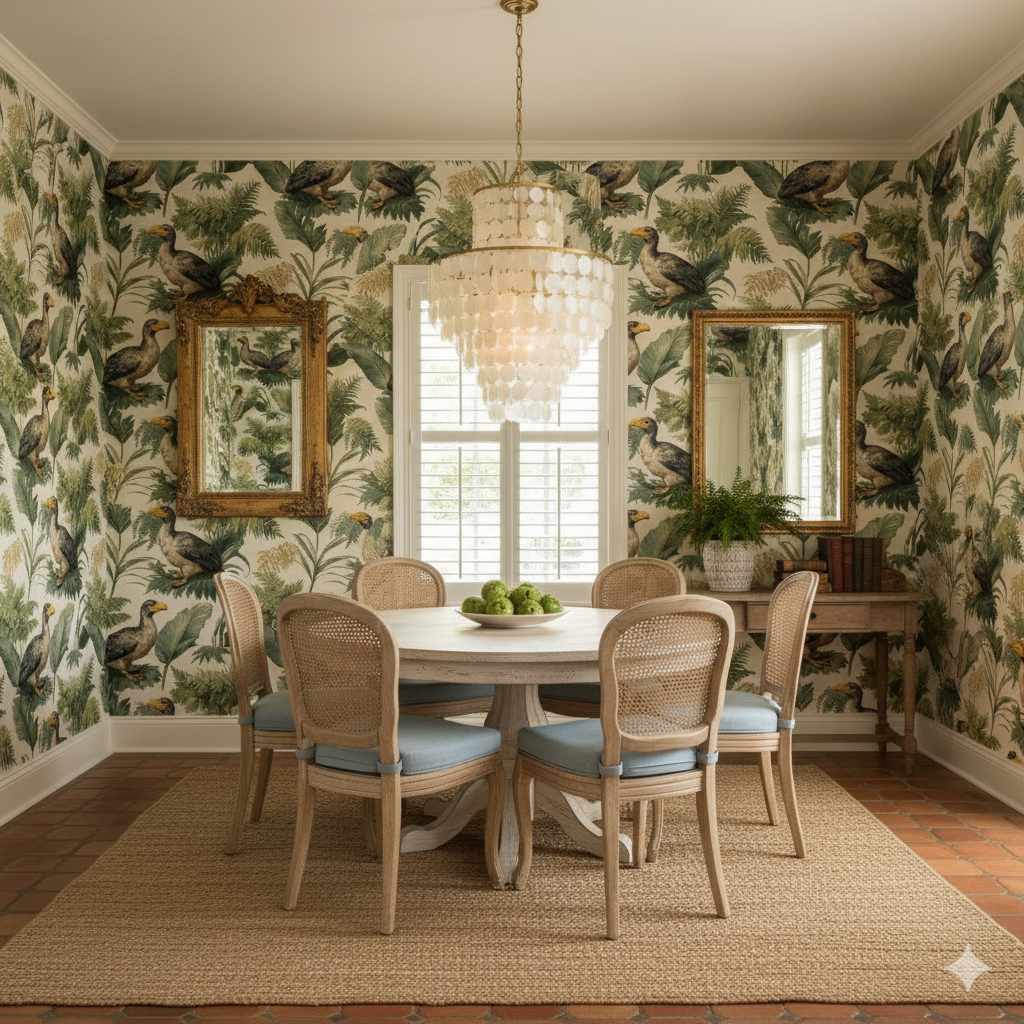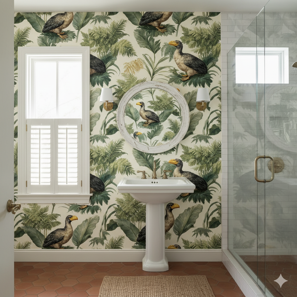Majestic dodo birds perch among dense fronds of banana leaves and ferns, painted in muted greens with delicate detailing that recalls old-world botanical engravings. The birds themselves — rendered in soft gray plumage with striking golden beaks and legs — carry an air of curiosity and nostalgia. Their extinct presence gives the design a haunting allure, turning the wallpaper into both a natural history tableau and a conversation piece. Isle of the Forgotten fits perfectly in study walls, libraries, or eclectic dining rooms where stories are told and history is celebrated. It adds gravitas when paired with rich woods, leather-bound books, or brass accents, but it also works in modern tropical-inspired interiors as a tongue-in-cheek nod to the lost wonders of exploration.
