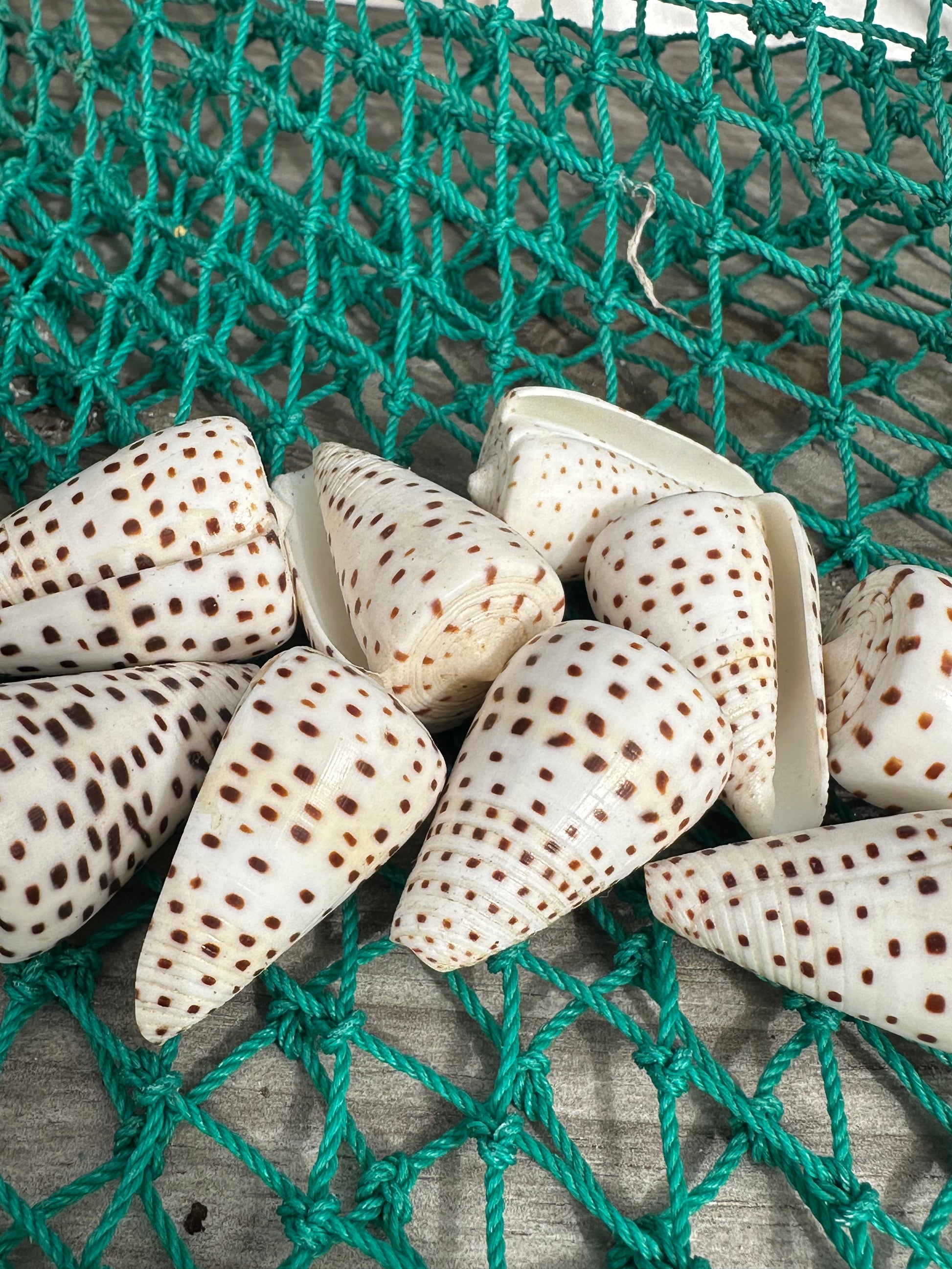 The Ivory Cone shell, scientifically known as Conus eburneus, is a striking addition to any coastal décor or shell collection. Its smooth, glossy surface features a captivating combination of black or dark brown spots contrasted with creamy bands that wrap elegantly around the shell. This unique pattern gives it a sophisticated and natural charm, making it ideal for display, crafting, or jewelry-making.
