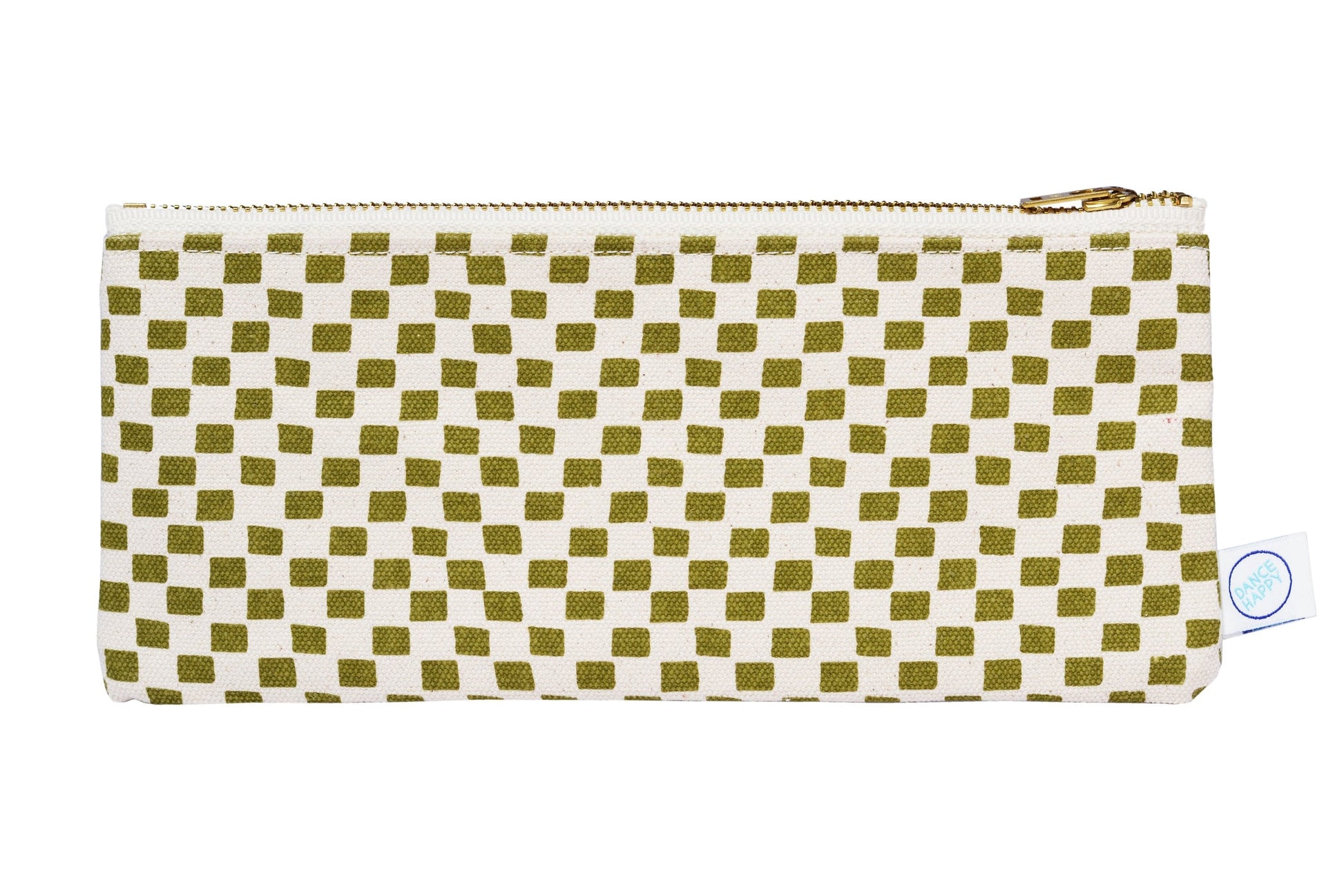 Perfect for pencils, art supplies, knick-knacks, or even make-up brushes, this eco-friendly cotton canvas pencil case has a brass zipper along the top to keep all your treasures secure. This zip case features a hand cut checkered pattern screenprinted in army green.