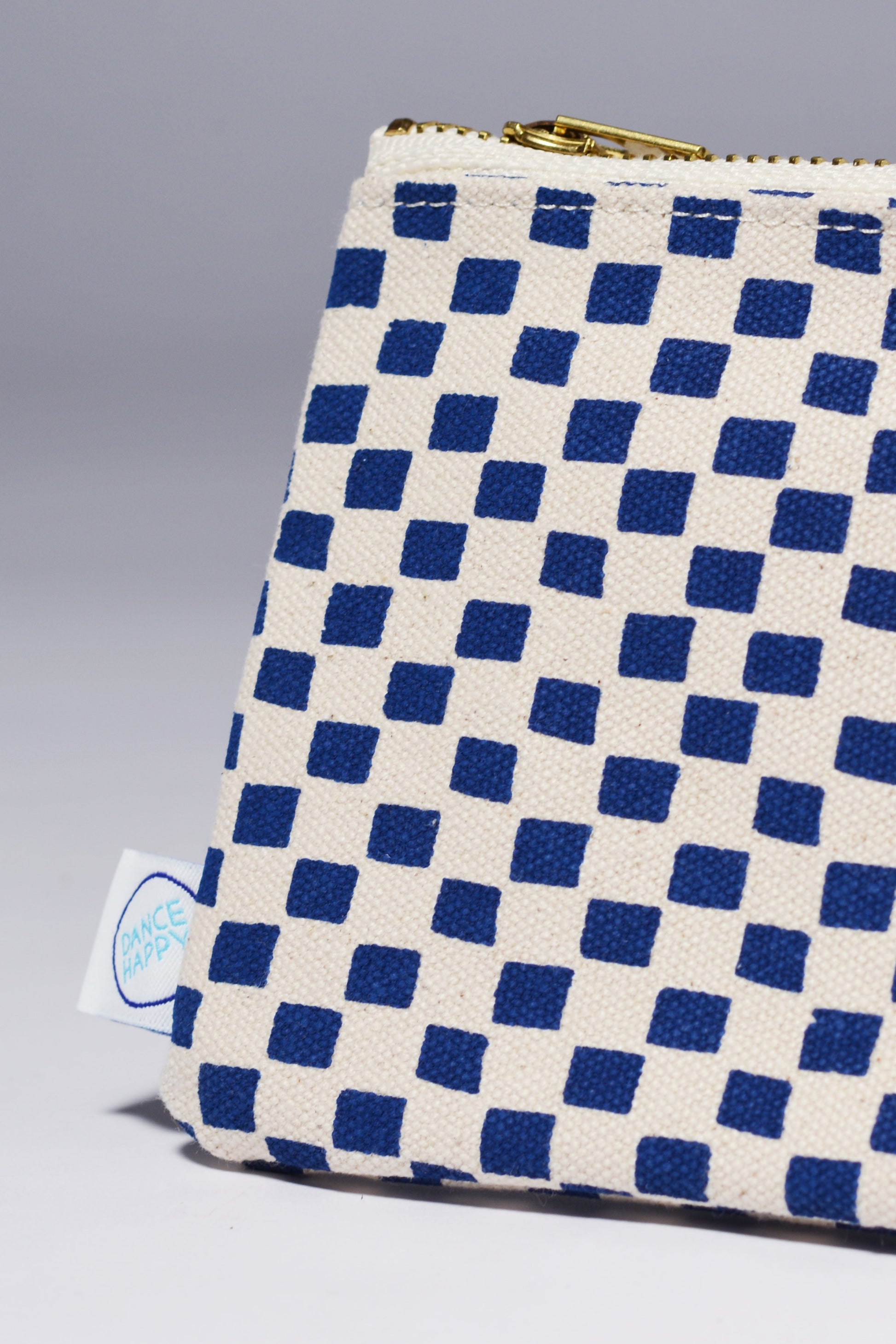 Perfect for pencils, art supplies, knick-knacks, or even make-up brushes, this eco-friendly cotton canvas pencil case has a brass zipper along the top to keep all your treasures secure. This zip case features a hand cut checkered pattern screenprinted in navy.