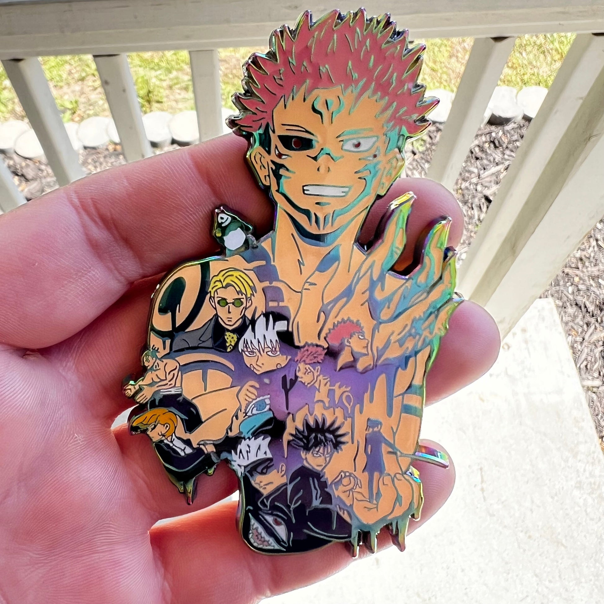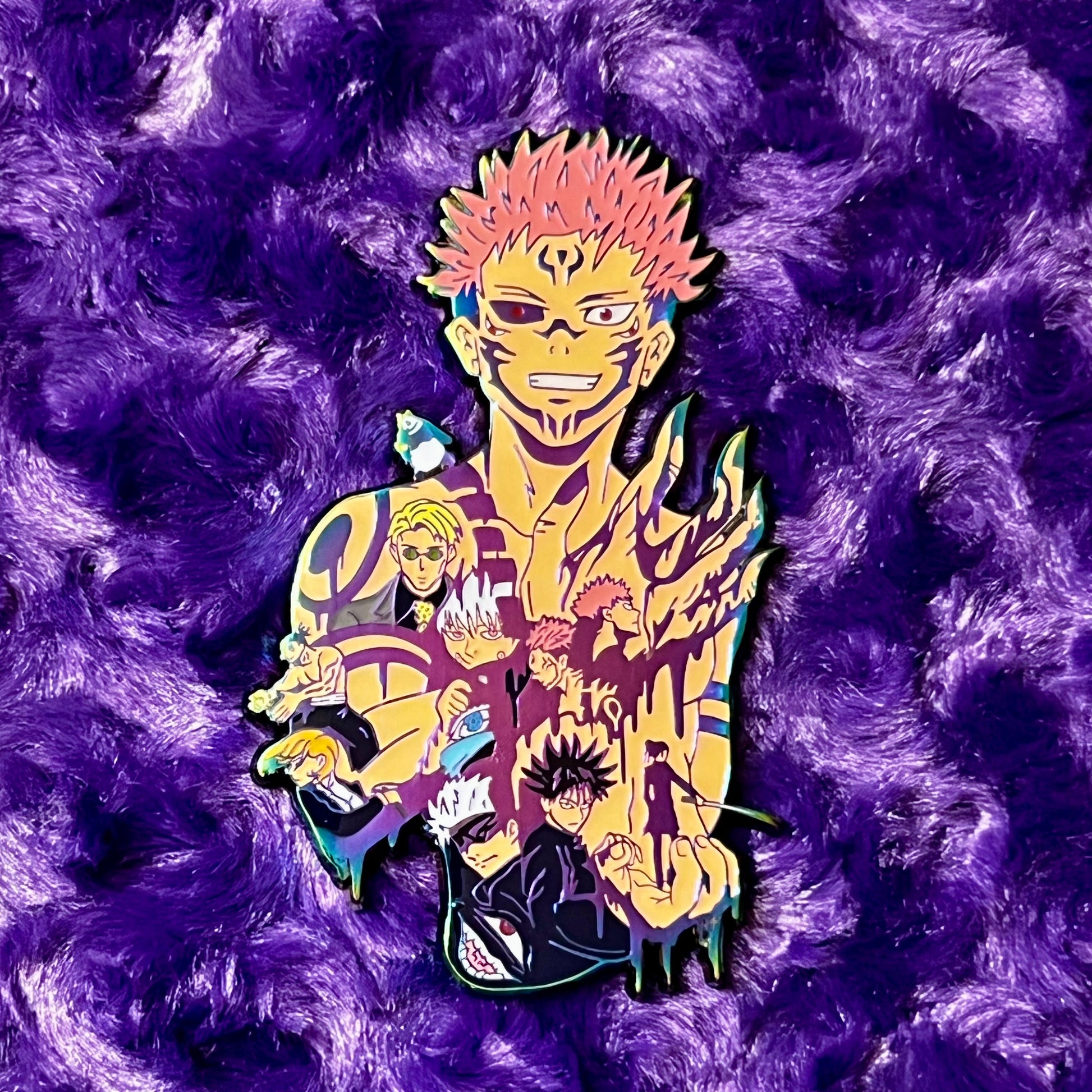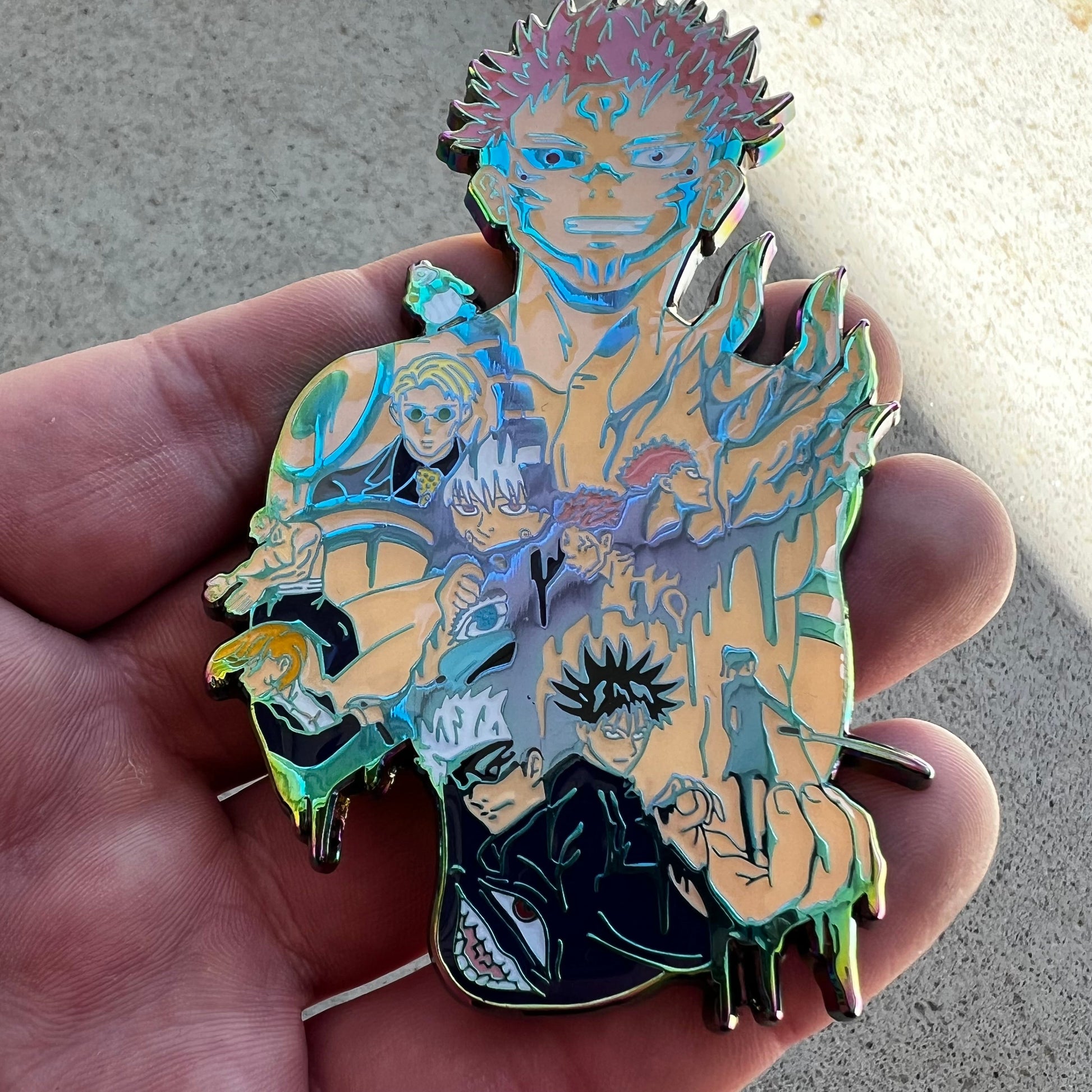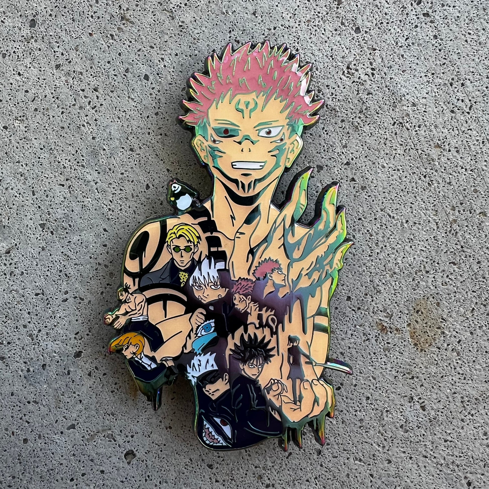 This pin captures the essence of jujutsu sorcery with its impressive 4-inch height, rainbow metal finish that shifts colors like cursed energy, and green glow that illuminates in darkness. Whether you're displaying it in your collection or wearing it to conventions, this pin commands attention and showcases your dedication to one of anime's most legendary series.