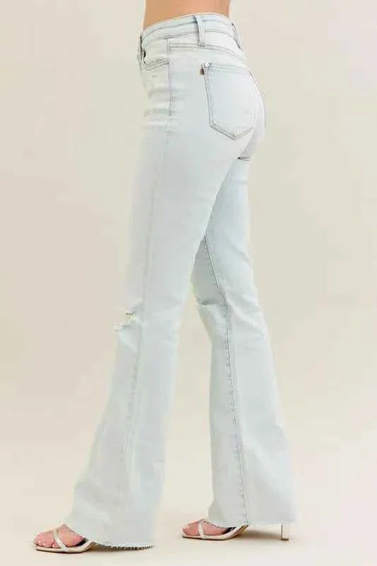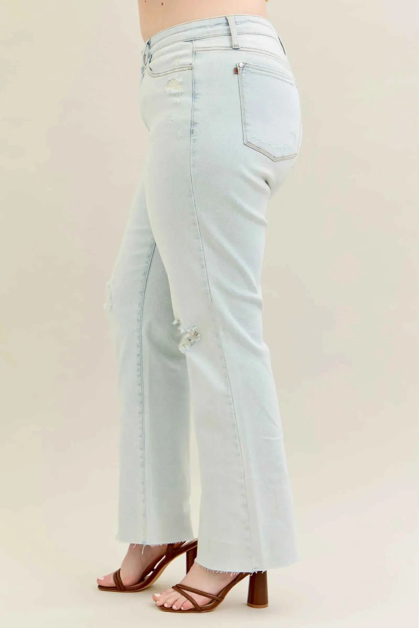 These stunning light blue high-waisted straight leg jeans feature fashion distressed detailing at the knees for an effortlessly cool look. Crafted from premium cotton denim blend, they offer comfortable stretch and durability. The high-rise waistline creates a flattering silhouette while the straight leg cut provides a timeless appeal. Perfect for casual outings or dressed up occasions, these jeans showcase carefully placed rips and fading for an authentic vintage-inspired aesthetic. The light wash denim pairs beautifully with any top, making them a versatile wardrobe essential.