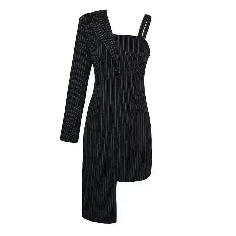 A mélange of traditional pinstripe detailing and dramatic cuts, the Juliette takes the blazer dress trend to an entirely new level. One side features a traditional approach with a classic notched lapel, full-length sleeves and shoulder pads, with a hem that finishes just below the knee. In an unexpected twist, the other side showcases a bare shoulder with a block strap and finishes with a shorter, asymmetrical hem. Melded together by a simple center button, there’s no way this ultra-trendy pinstripe blazer dress won’t turn heads.