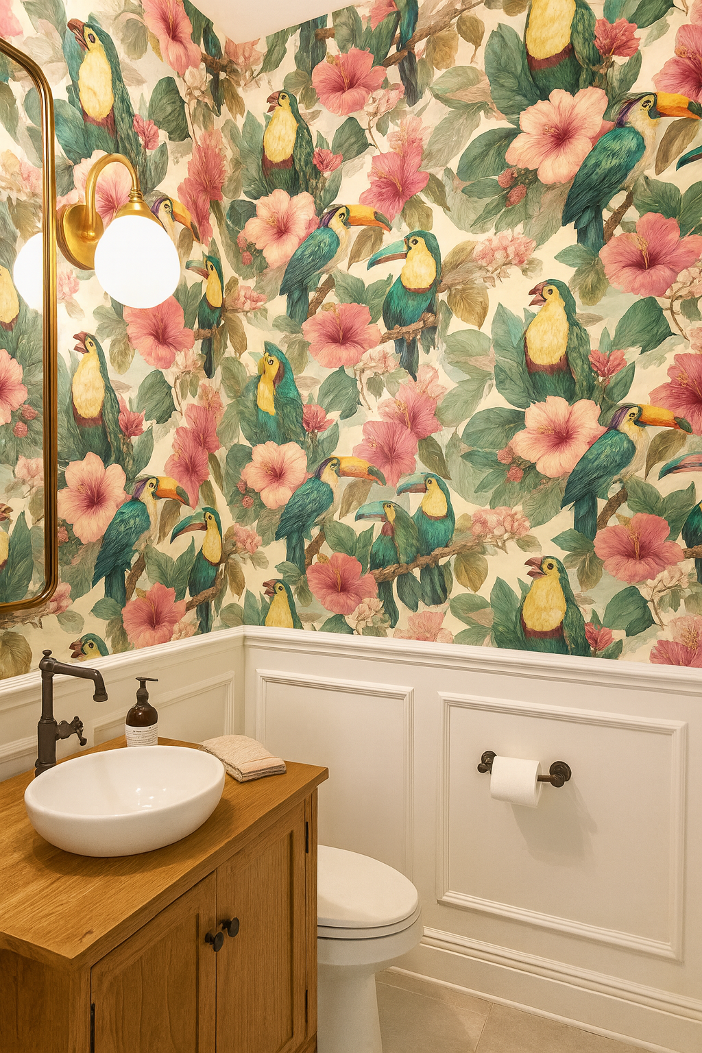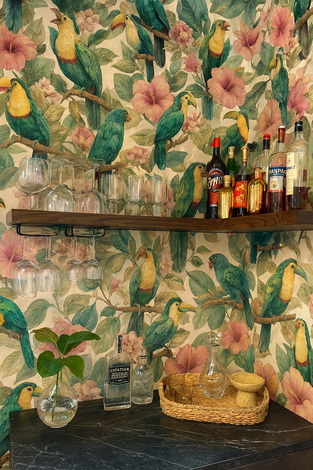 A lush chorus of rainforest life, this tropical tableau captures vibrantly feathered parrots and toucans nestled amidst oversized hibiscus blossoms and textured foliage. The birds’ plumage is rendered in rich greens, teals, and golden yellows with painterly detail, creating a sense of movement and exotic rhythm. Named "Jungle Cantata" for its orchestral layering of color and form, this print sings with visual harmony and layered storytelling — ideal for bold interior spaces or maximalist textiles.