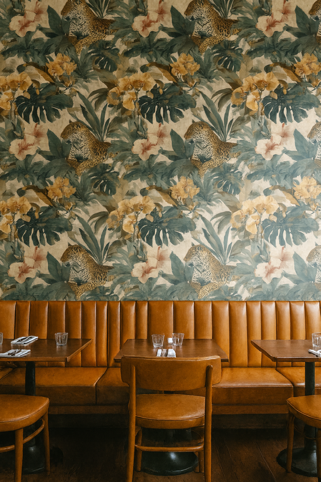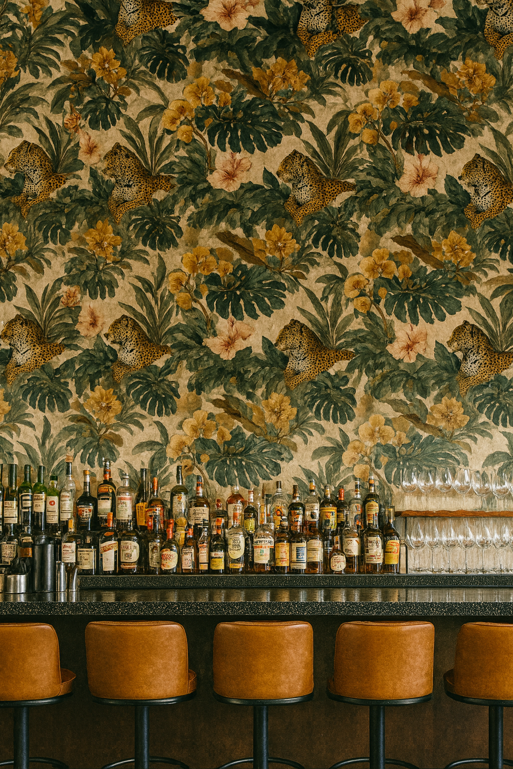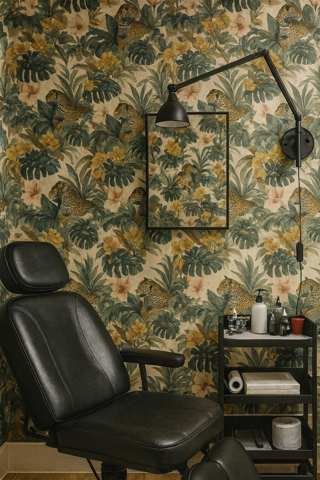 A lush and dramatic tropical scene where golden jaguars recline among oversized monstera leaves, ochre orchids, and creamy hibiscus blooms. The palette is grounded in deep forest greens and sunlit golds, giving this design an old-world botanical feel with a powerful edge. Perfect for boutique hotel accent walls, luxurious upholstery, or daring powder room statements.