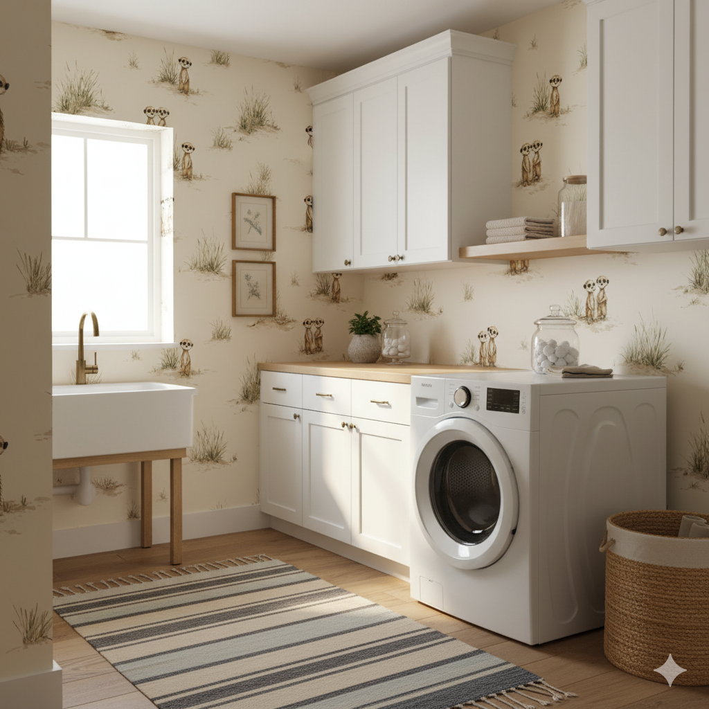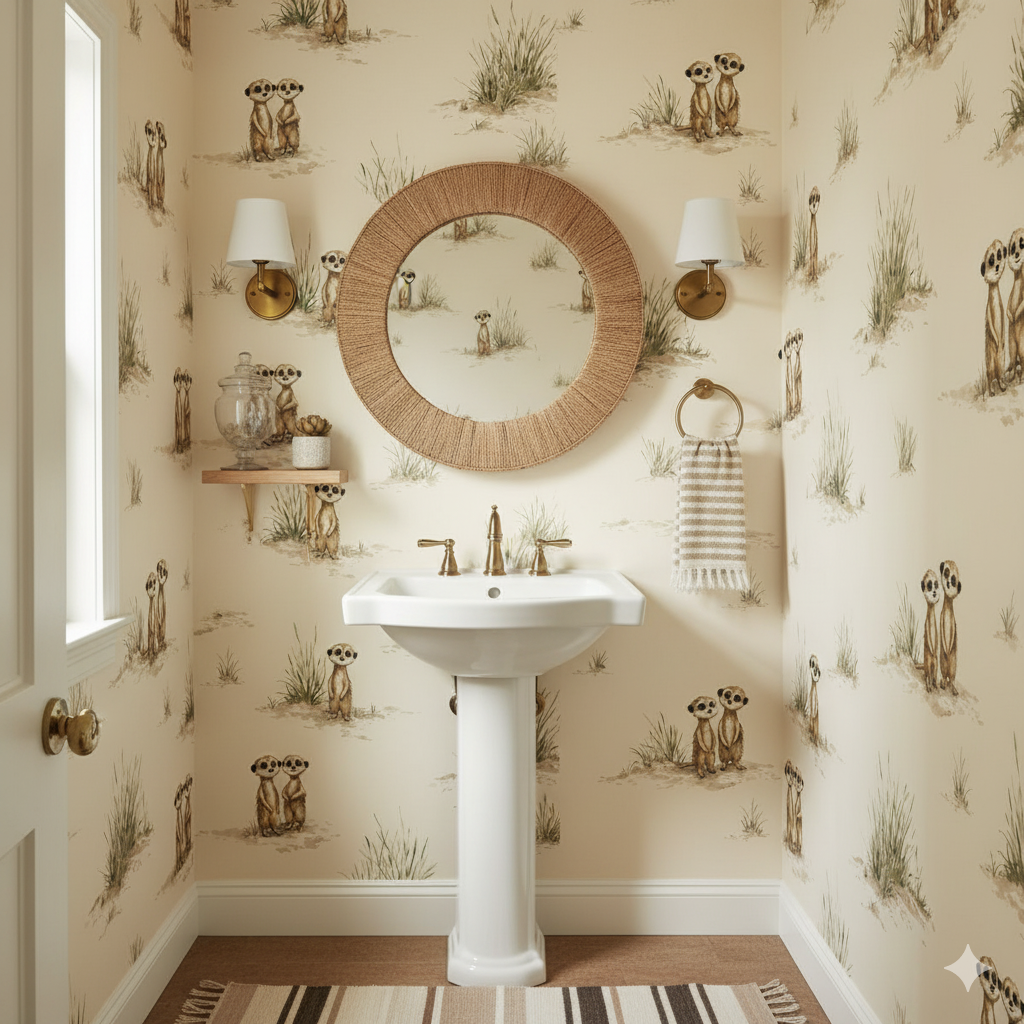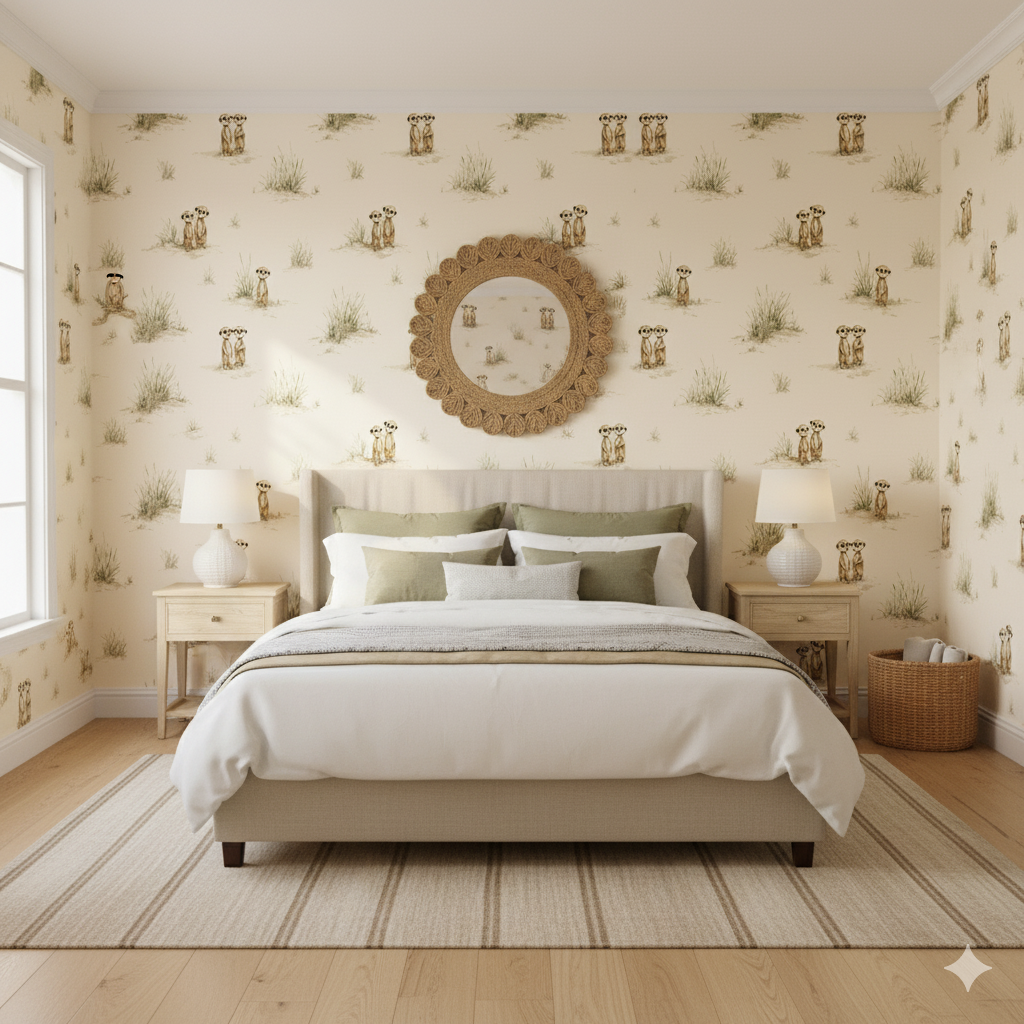 Charming meerkats, hand-drawn with wide-eyed alertness, stand in pairs and trios among tufts of desert grass on a sandy neutral ground. The repeat feels spacious and breathable, leaving room for the figures to tell their story without overwhelming the wall. This is a playful pattern for nurseries, children’s rooms, or any space where a touch of whimsy is welcome. The earthy palette of soft beige, warm brown, and muted green lends it versatility—it feels gentle and approachable rather than loud. Pair with natural wood cribs, woven baskets, or safari-inspired décor to create a warm and inviting environment full of personality.