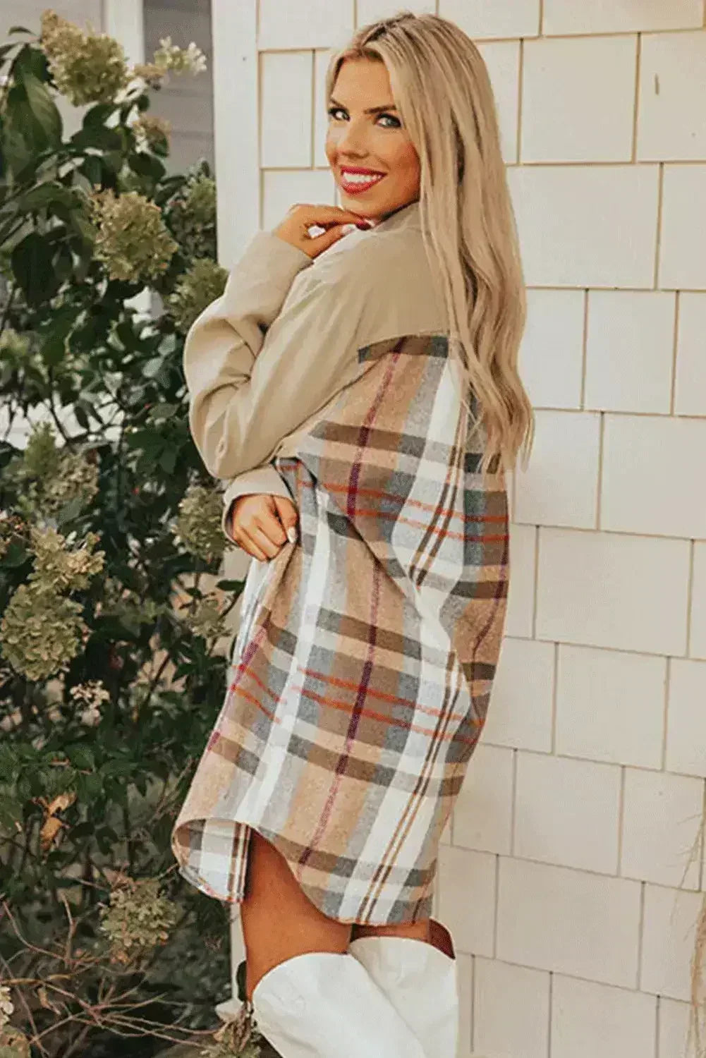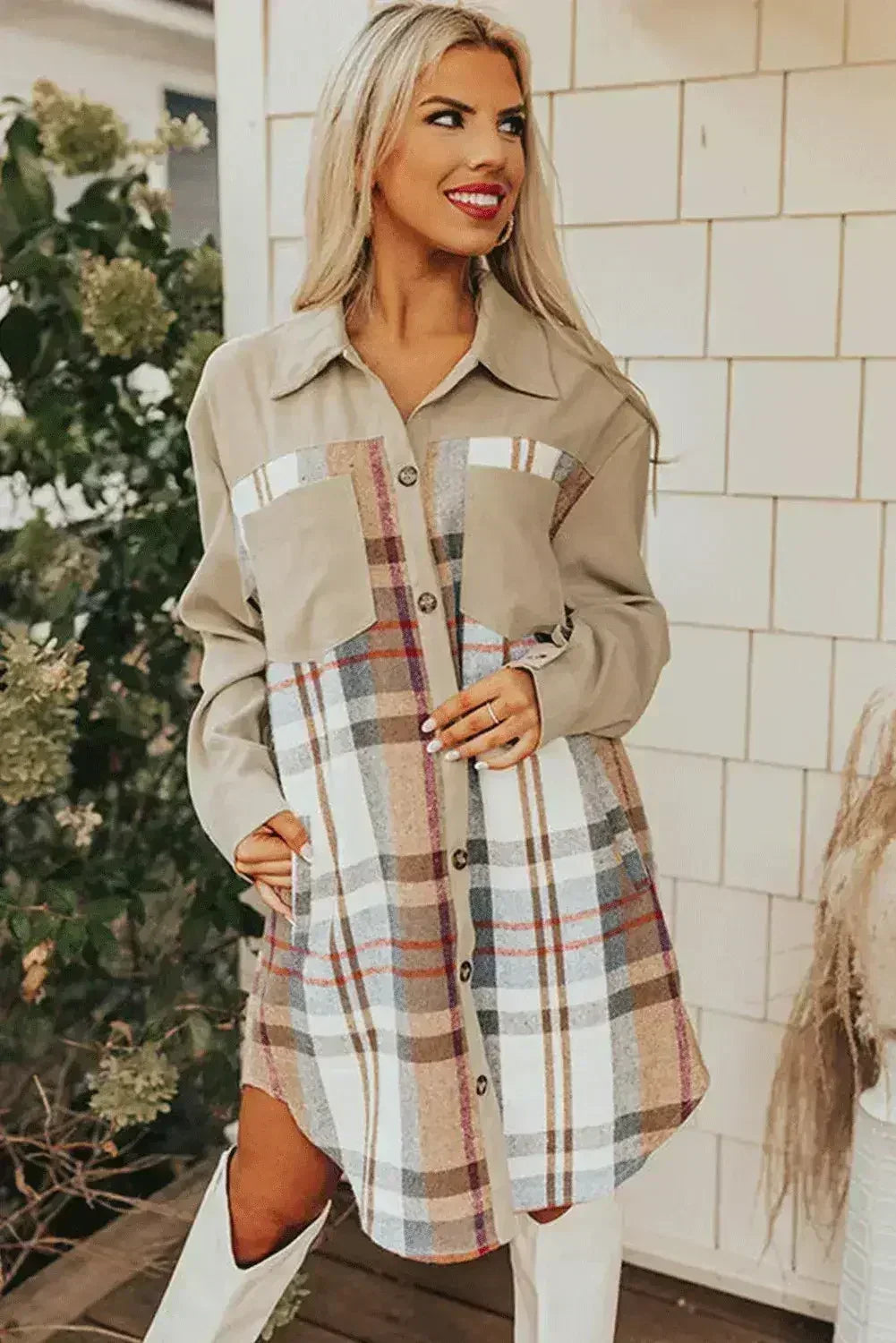Khaki Plaid Patchwork Long Sleeve Mini Dress with Pockets