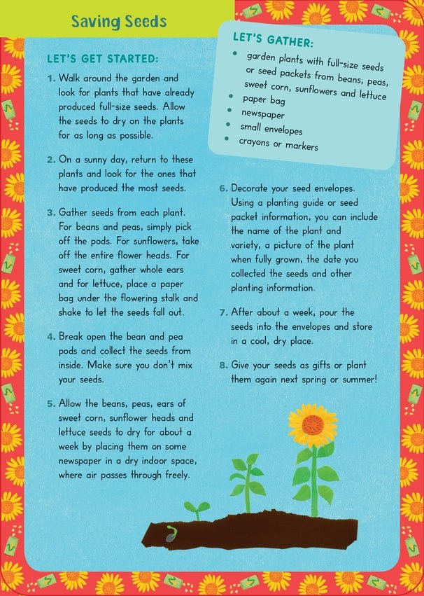 Dig in, explore the garden and have fun indoors and out! Fifty easy-to-follow activity cards in 5 engaging categories invite children to learn not just the basics of gardening, but also new ways of looking at nature. Creative games, nature-themed crafts and unique experiments are enhanced by colorful collage artwork on each double-sided card. Kid-friendly explanations of the history and science behind each activity make this product a valuable multi-layered educational resource. Includes an 8-page booklet that contains information on gardening tools, year-round plant care and garden safety.