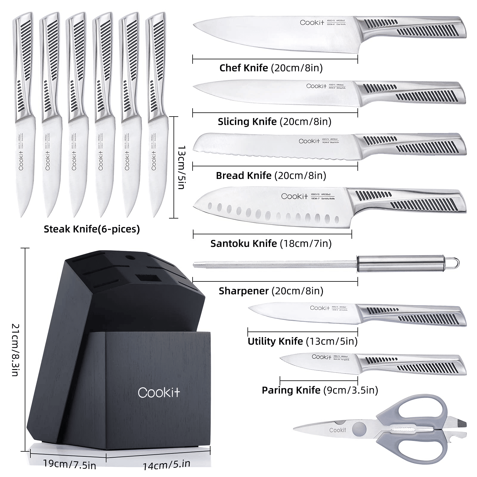 15-In-One Knife SetCookit knives block set contains all tools you need in kitchen cutting tasks; suitable for both professional and home use.