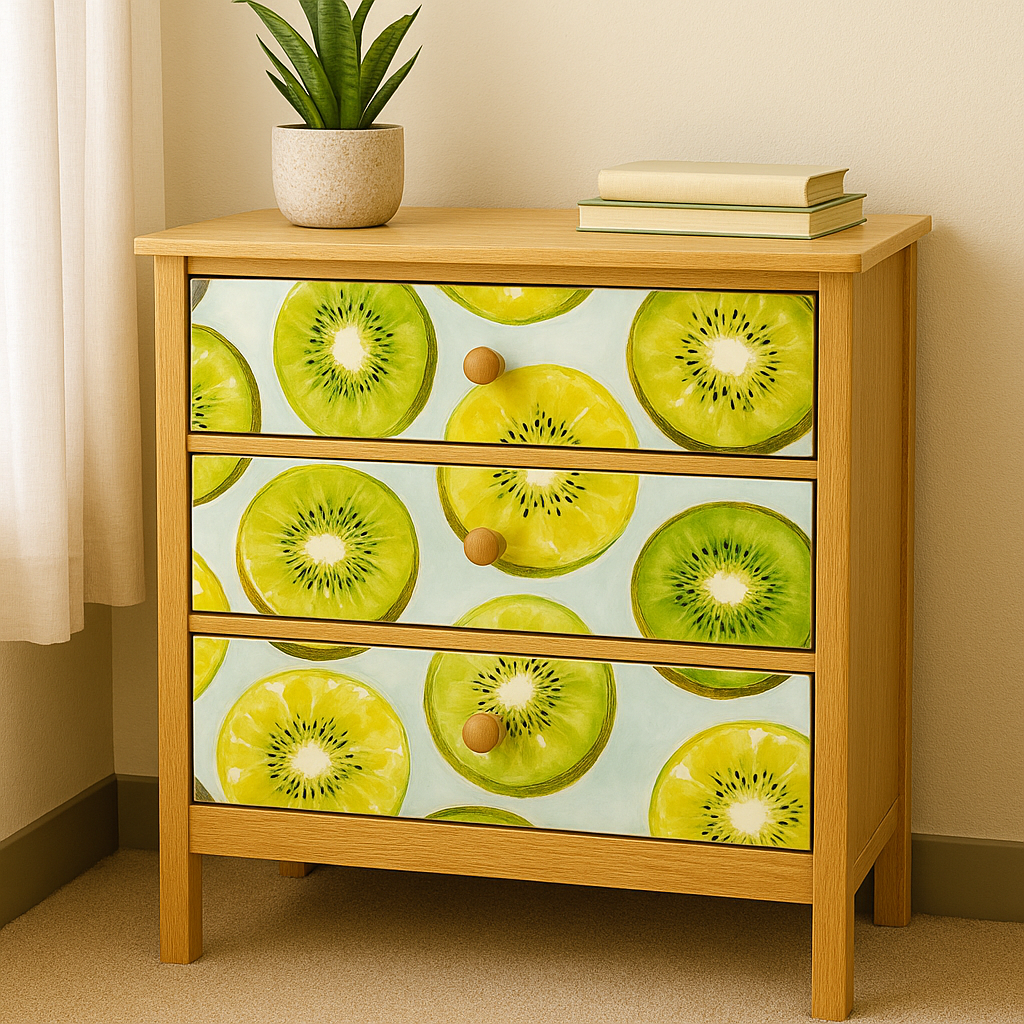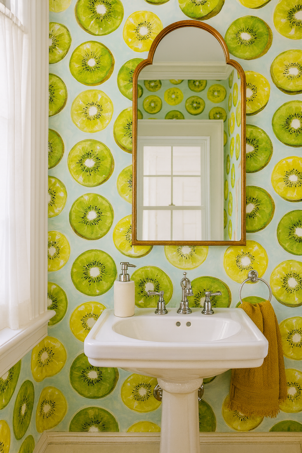 Fresh, juicy, and full of zest, "Kiwi Pop" features bright watercolor slices of green and gold kiwi on a soft blue-white background. The playful repetition and high-contrast seeds create a fun, fruity vibe that feels ideal for summer kitchens, eclectic bathrooms, or kid-friendly dining spaces. This fruit wallpaper is a modern splash of tropical joy with an artistic twist.