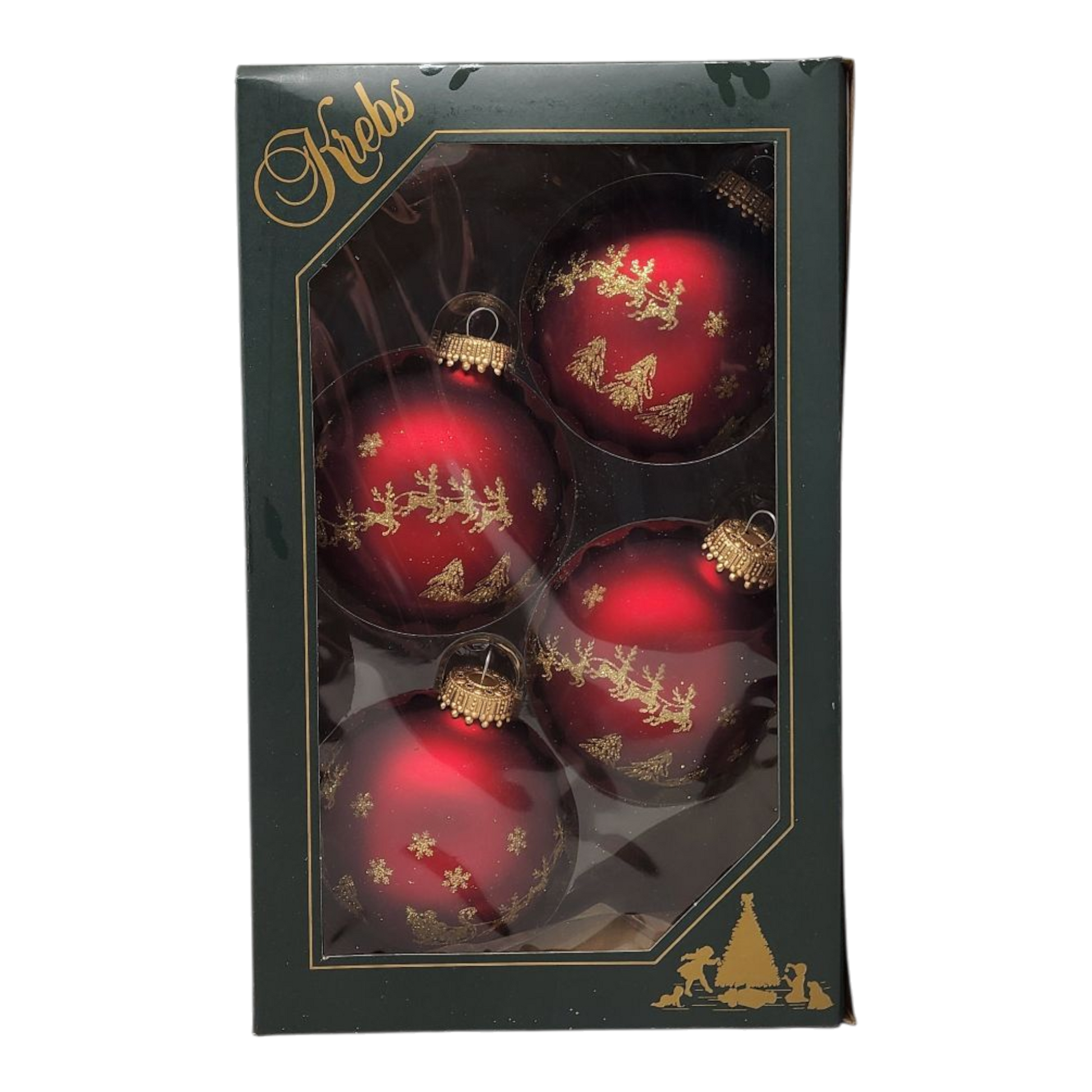 Bring the magic of the season to life with our enchanting set of four red glass ball ornaments, beautifully adorned with gold detailing! Each ornament features a rich matte red finish, ideal for capturing the festive spirit, while the intricate gold designs depict iconic holiday imagery, including Santa's sleigh, reindeer, and charming winter scenery. Measuring just over 2.5 inches in diameter, these stunning ornaments are perfect for decorating your Christmas tree or enhancing your seasonal displays.
