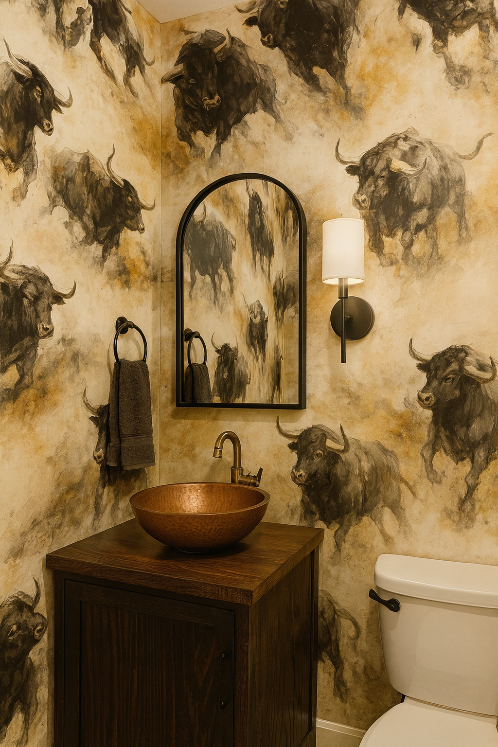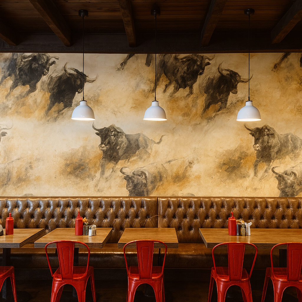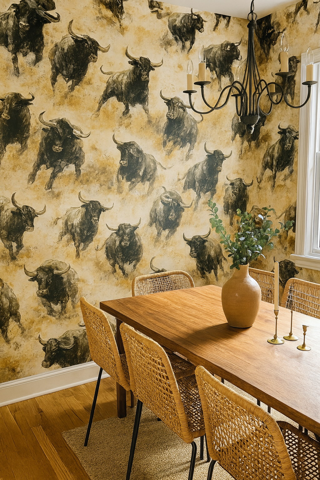 Charged with energy, this expressive ink-brush style wallpaper captures charging bulls mid-stampede, rendered in rich charcoal blacks and golden ochres. The dynamic brushstrokes evoke power and motion, while the parchment background softens the intensity. This is ideal for a bold statement wall in a study, whiskey lounge, or masculine bedroom. Untamed, artistic, and full of momentum.
