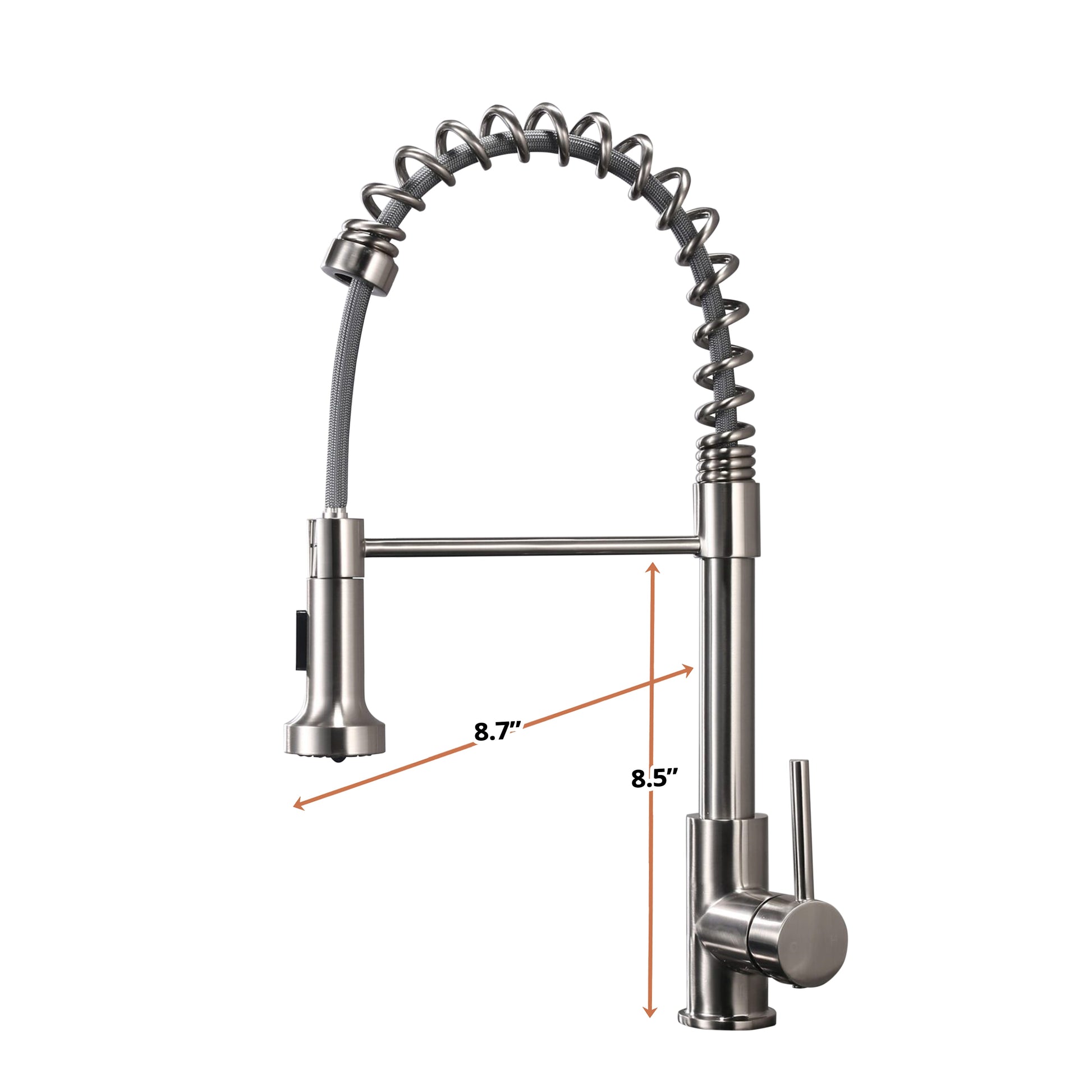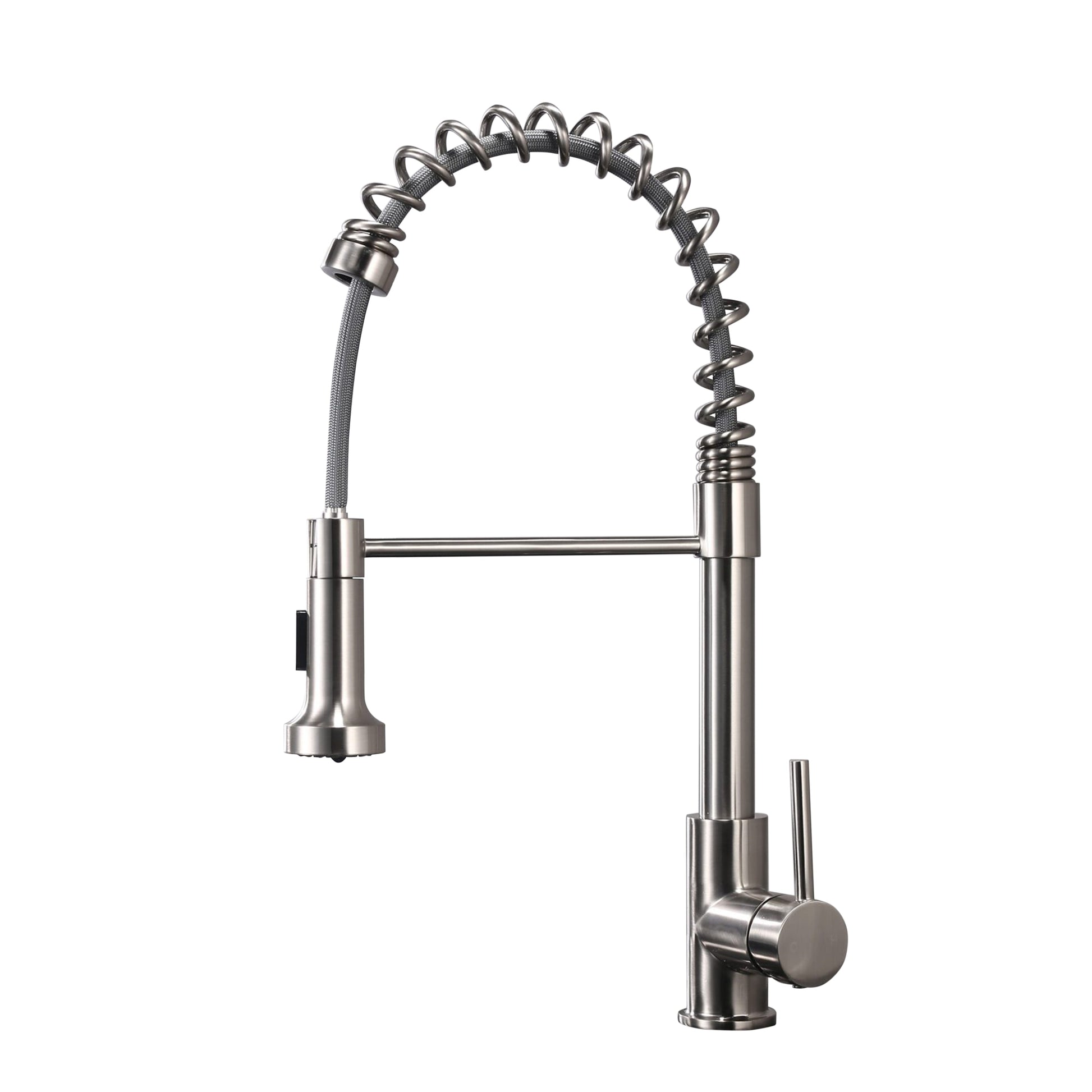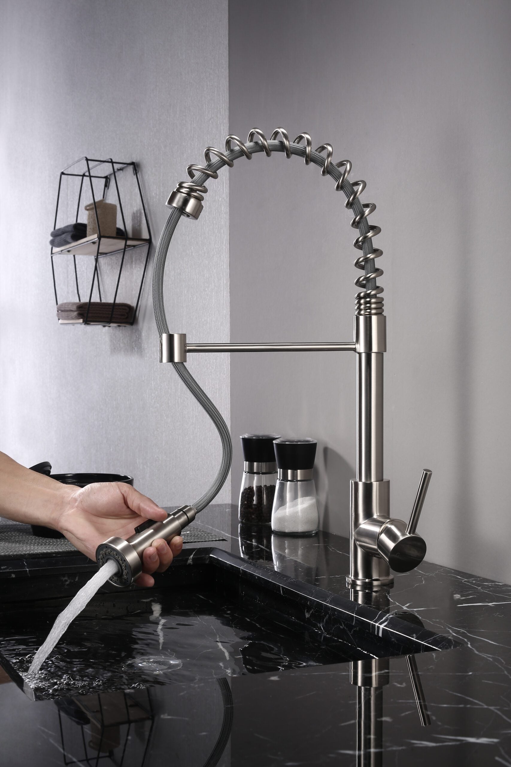 - Modern single-hole kitchen faucet with a brushed nickel finish