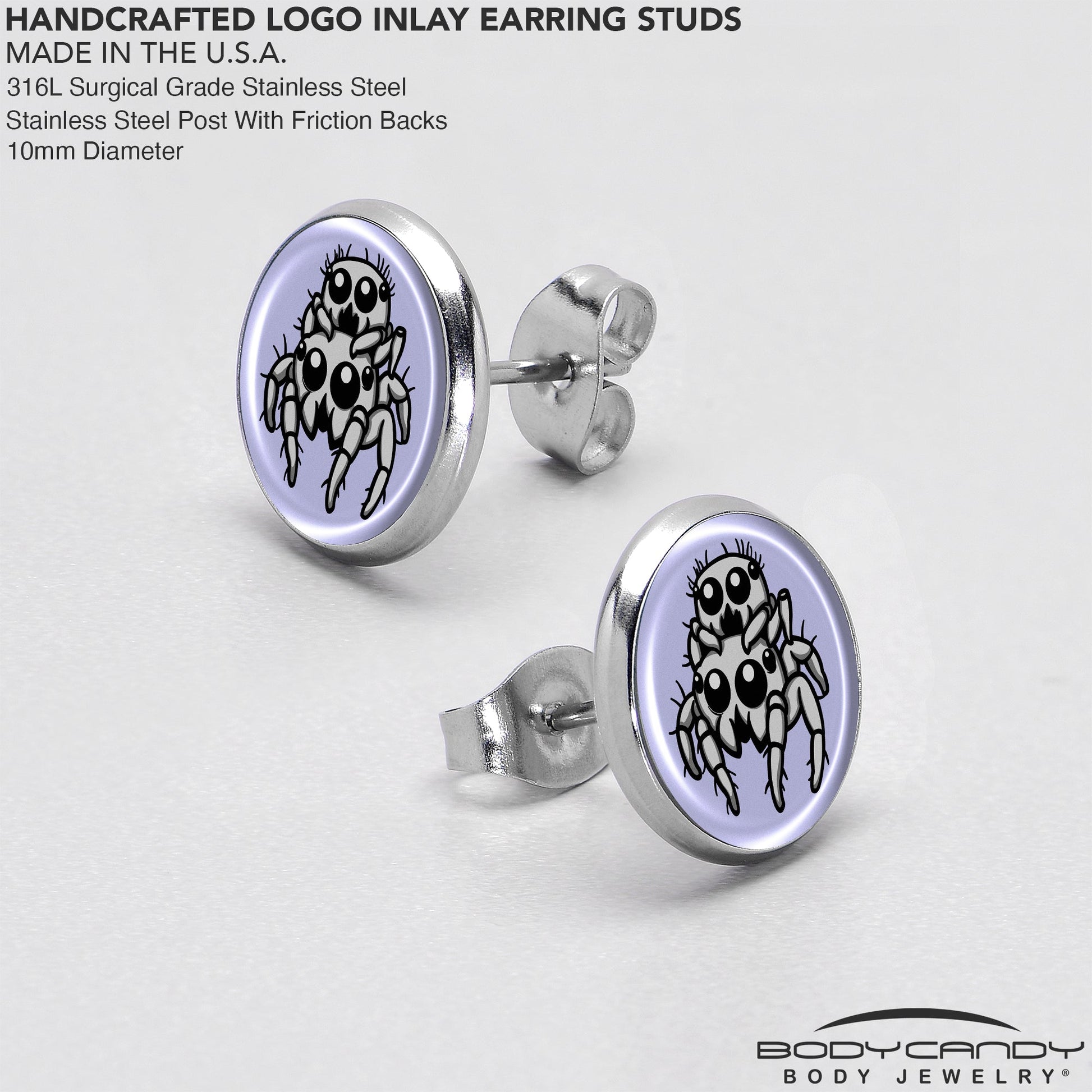 Add a playful touch to your ear jewelry collection with the Leaping Leapfrog Spiders earrings for pierced lobes! Featuring artist hand-drawn artwork of quirky leapfrog spiders, this unique piece is perfect for showing off your bold style. Crafted from hypoallergenic materials, these pierced earrings are gentle on sensitive skin and built for long-lasting wear. Hand-assembled in the USA, it combines creative artistry with meticulous craftsmanship to bring you a standout accessory that's truly one of a kind.