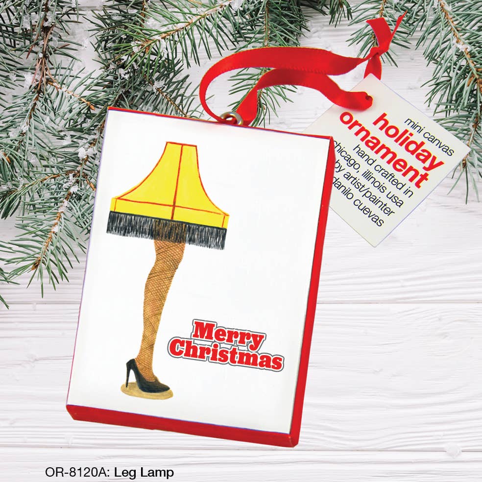 Leg Lamp, Ornament (OR-8120A) is made in the USA from oil paintings by artist, Danilo Cuevas. Miniaturized images mounted on a mini canvas. Each arrive with a red ribbon strand for easy hanging and display.