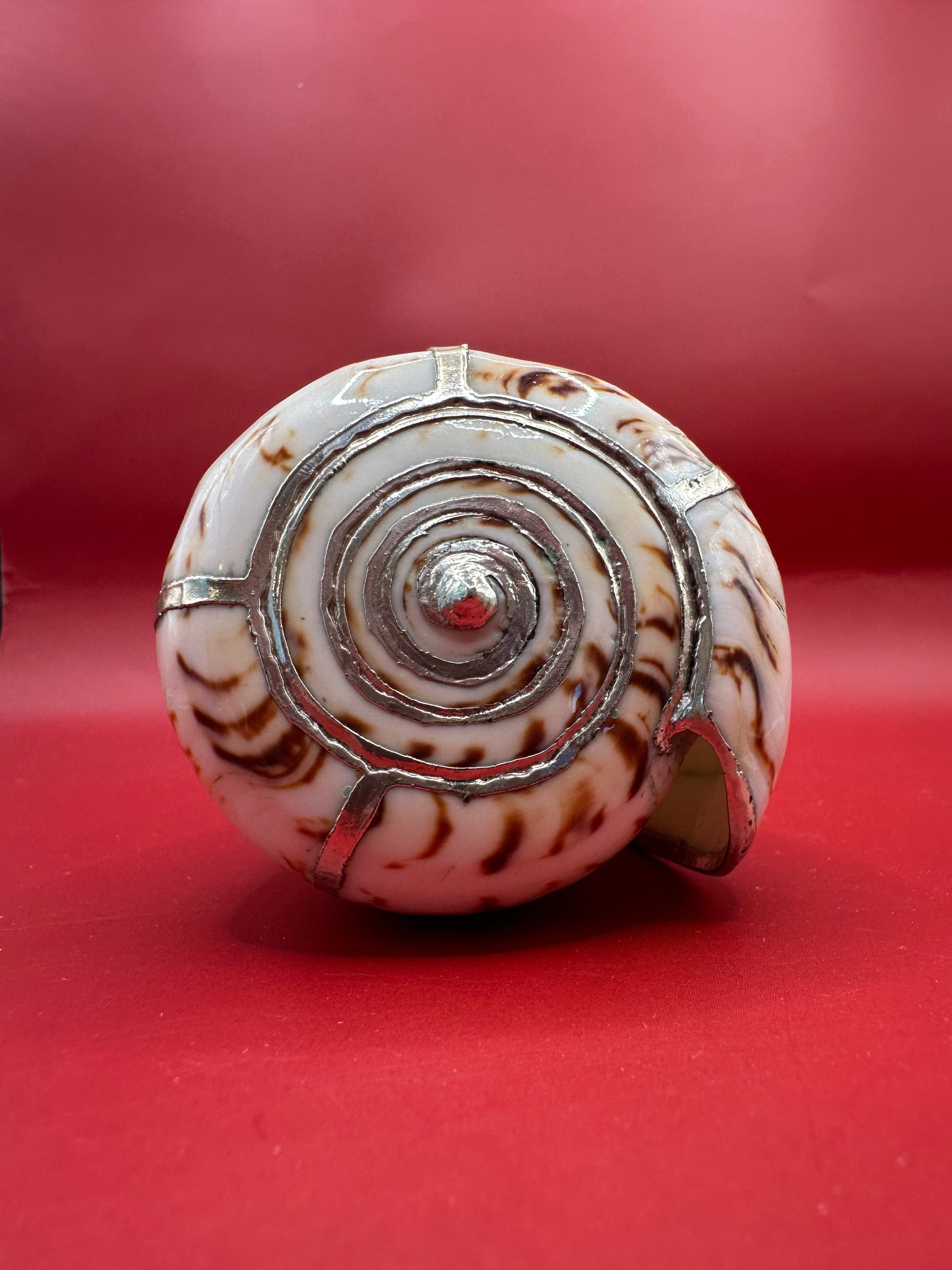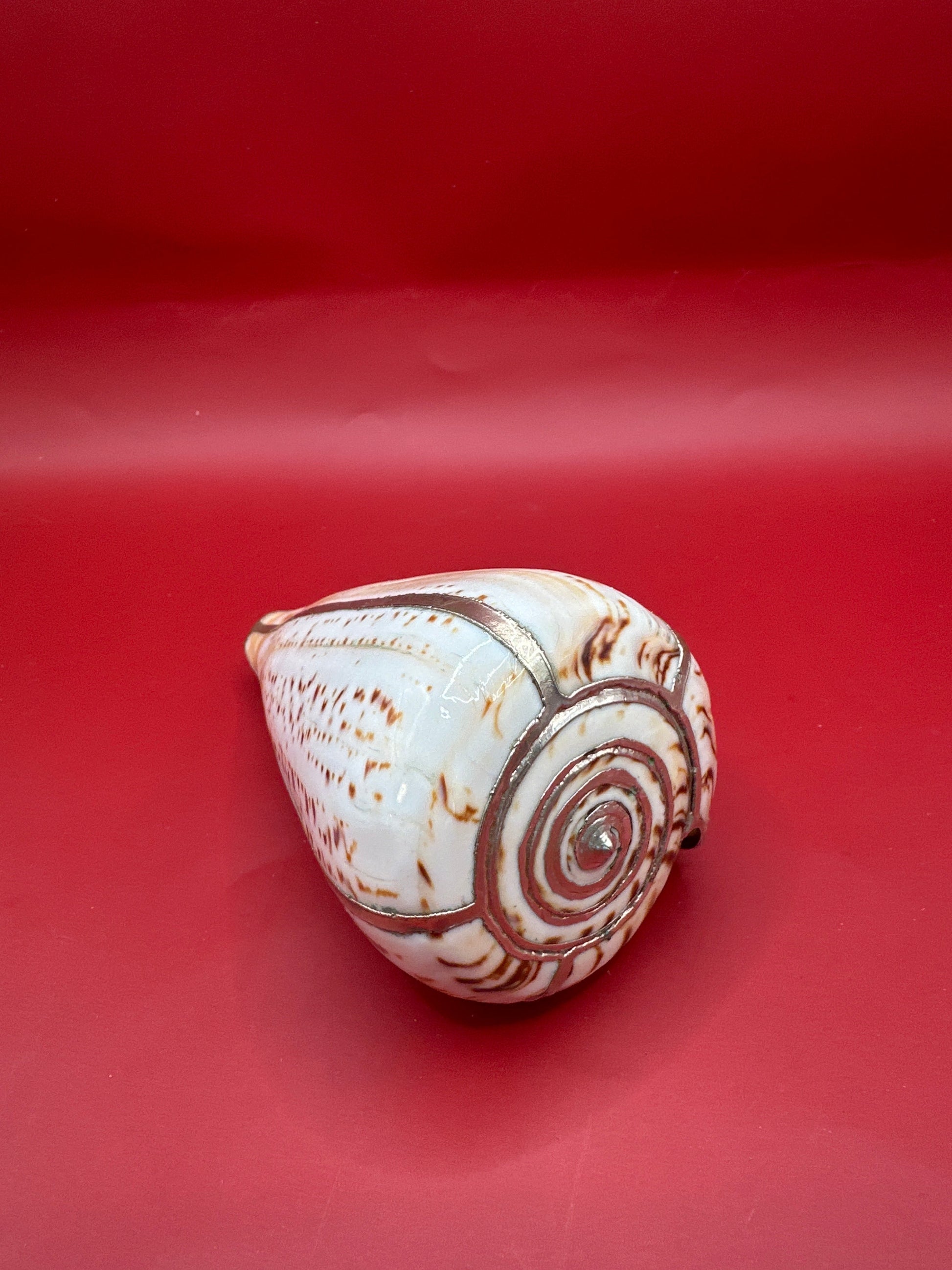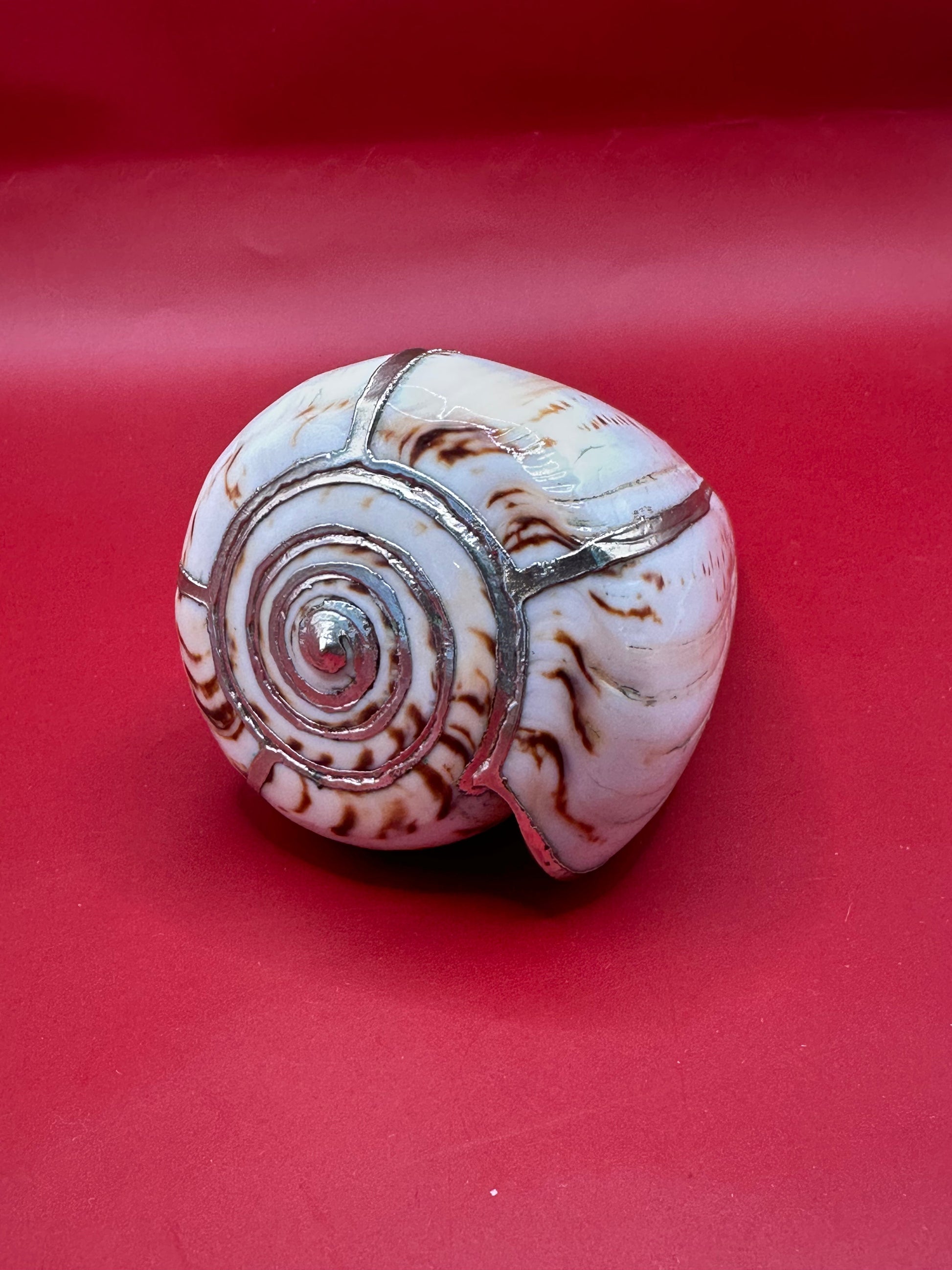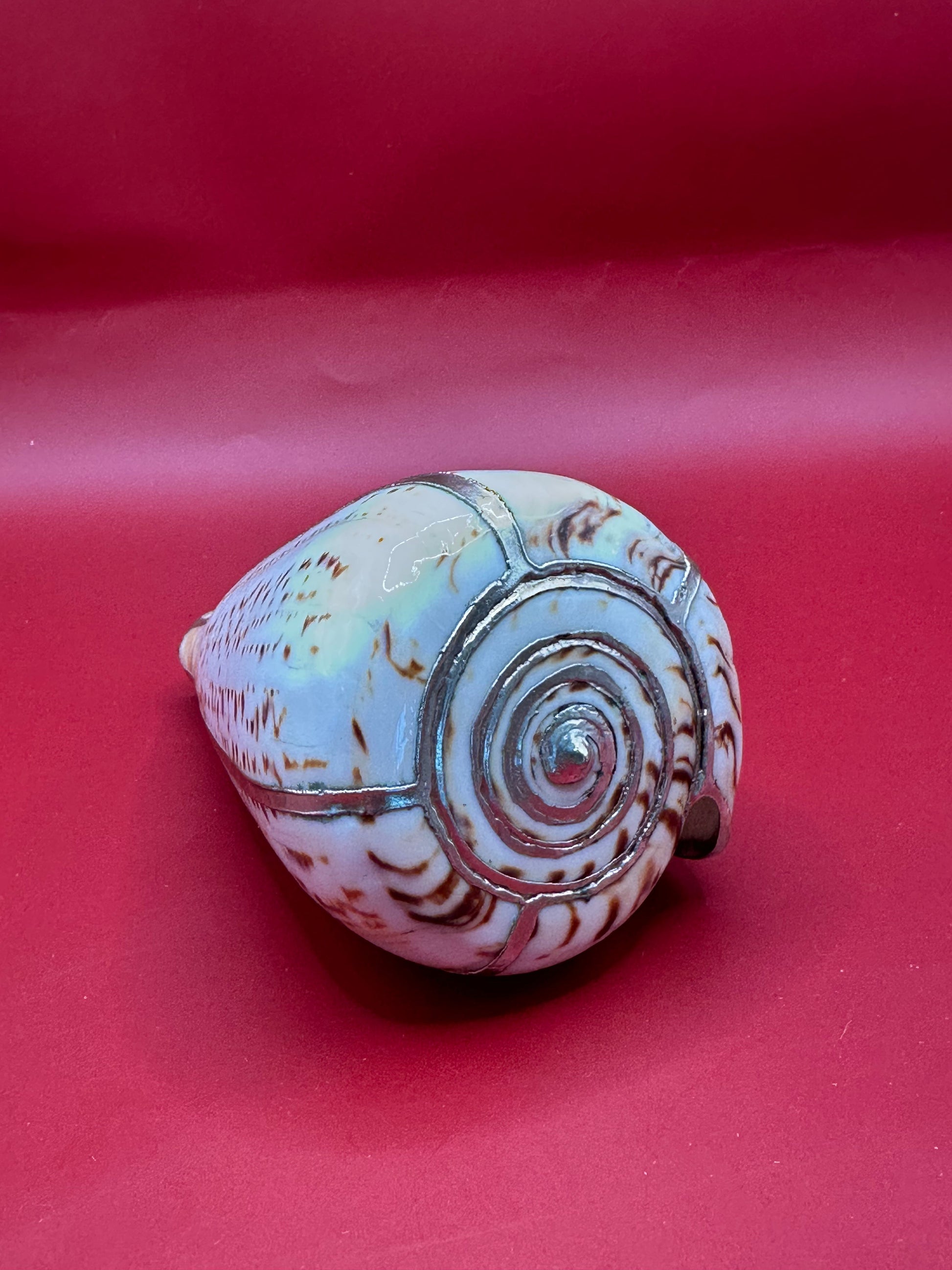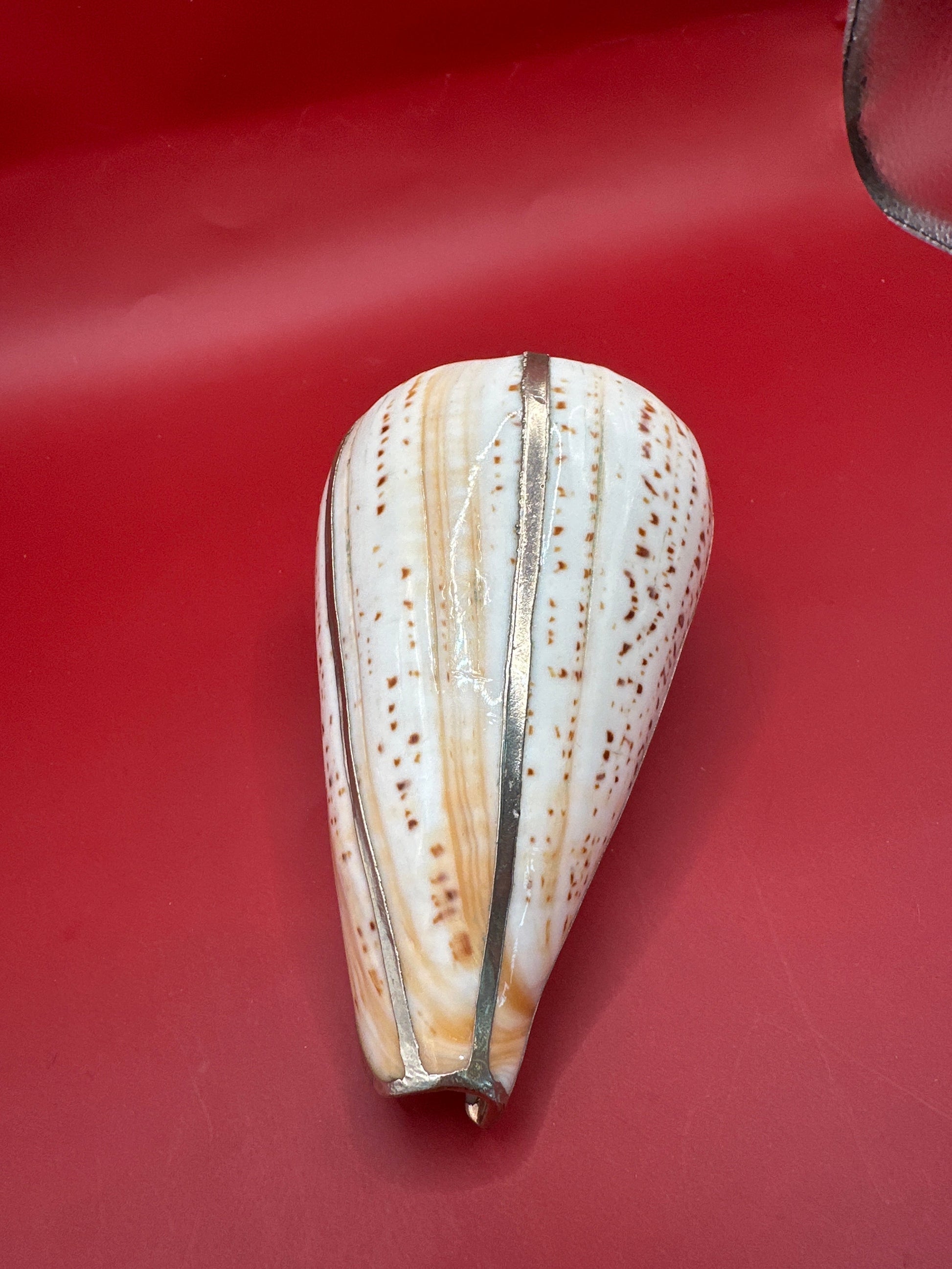 This striking lettered cone shell is enhanced with silver-plated accents that trace the spiral and seams, highlighting its creamy base and warm cinnamon markings. At approximately 4.25 inches long, it’s a refined coastal accent and the exact shell shown.