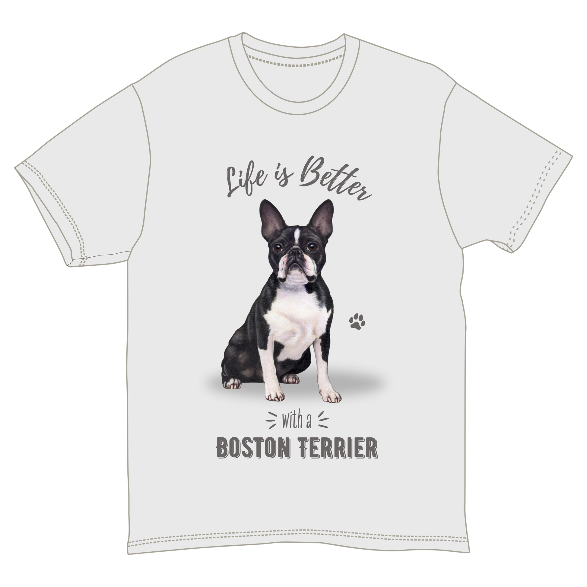 This charming t-shirt, made from 100% soft cotton, showcases an adorable Boston Terrier illustration along with the phrase "Life is Better with a BOSTON TERRIER." Its unisex design ensures comfort for everyone, making it an ideal choice for casual outings or relaxing at home. The breathable fabric guarantees a soft touch, perfect for all-day wear.
