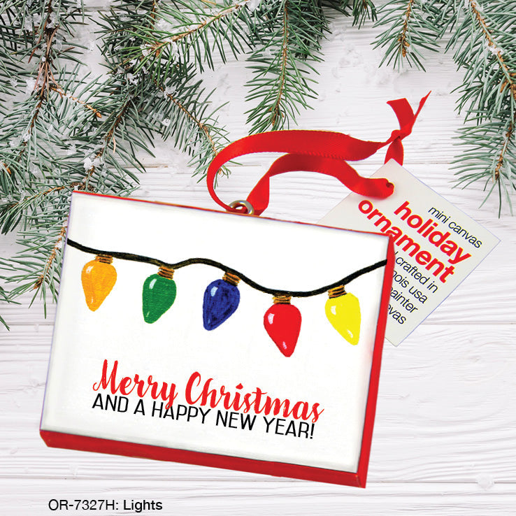 Lights, Ornament (OR-7327H) is made in the USA from oil paintings by artist, Danilo Cuevas. Miniaturized images mounted on a mini canvas. Each arrive with a red ribbon strand for easy hanging and display.