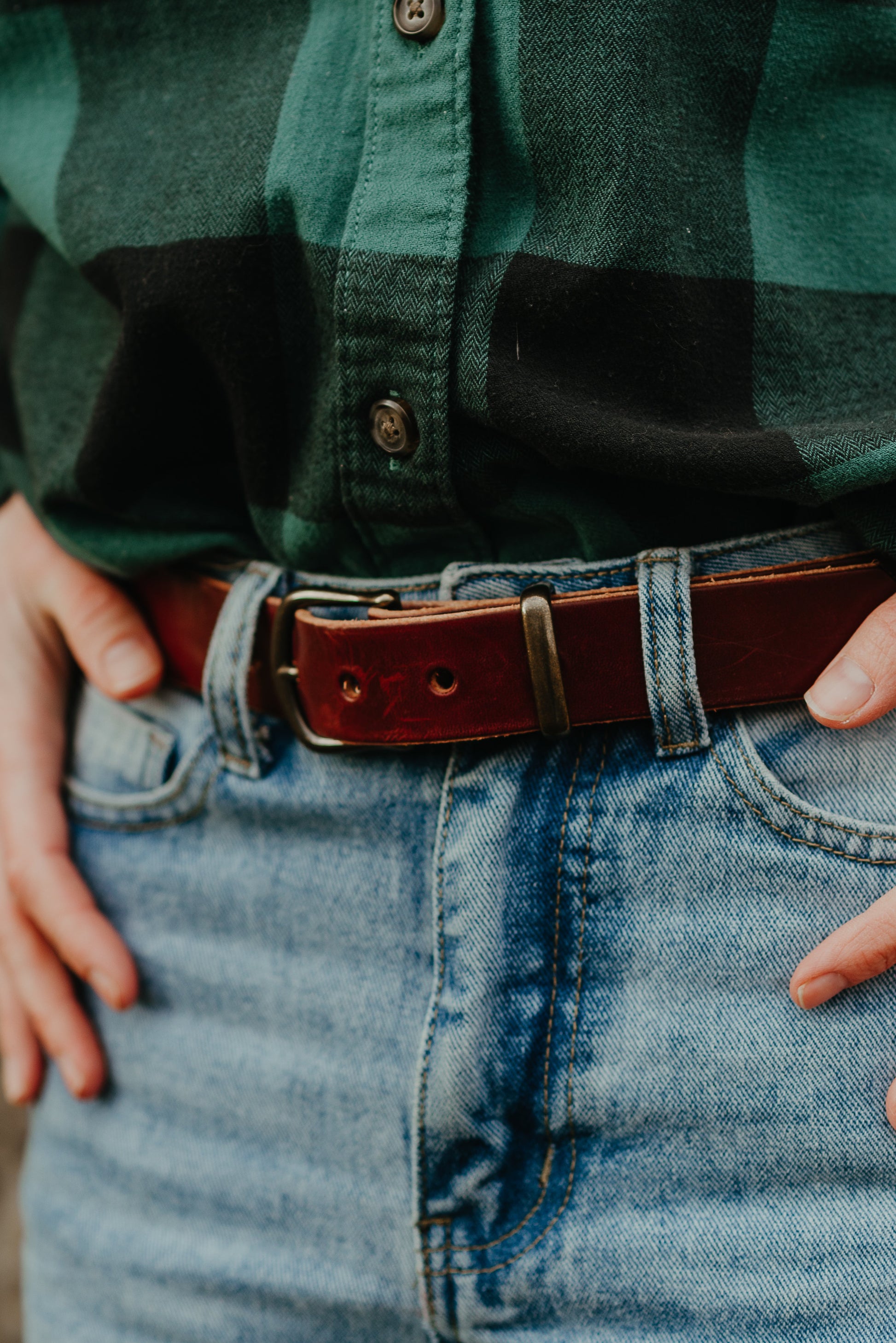 This Maroon Belt was created to have a slimmer dressier option. We still source our local native steer hides to produce this high quality leather, we simplify the crafting process by using rivets and beeswax to craft these belts. All of our belts come with a brass keeper, to ensure the high quality level and detailing of the belt. This belt is for you if you are looking for a light weight, smooth, and dressy belt.