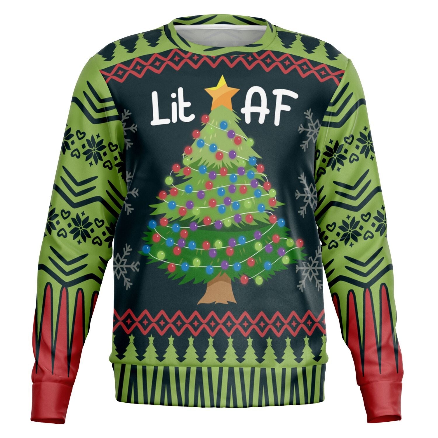 A bright and cheeky holiday staple featuring a colorful tree and “Lit AF” slogan for max party energy.