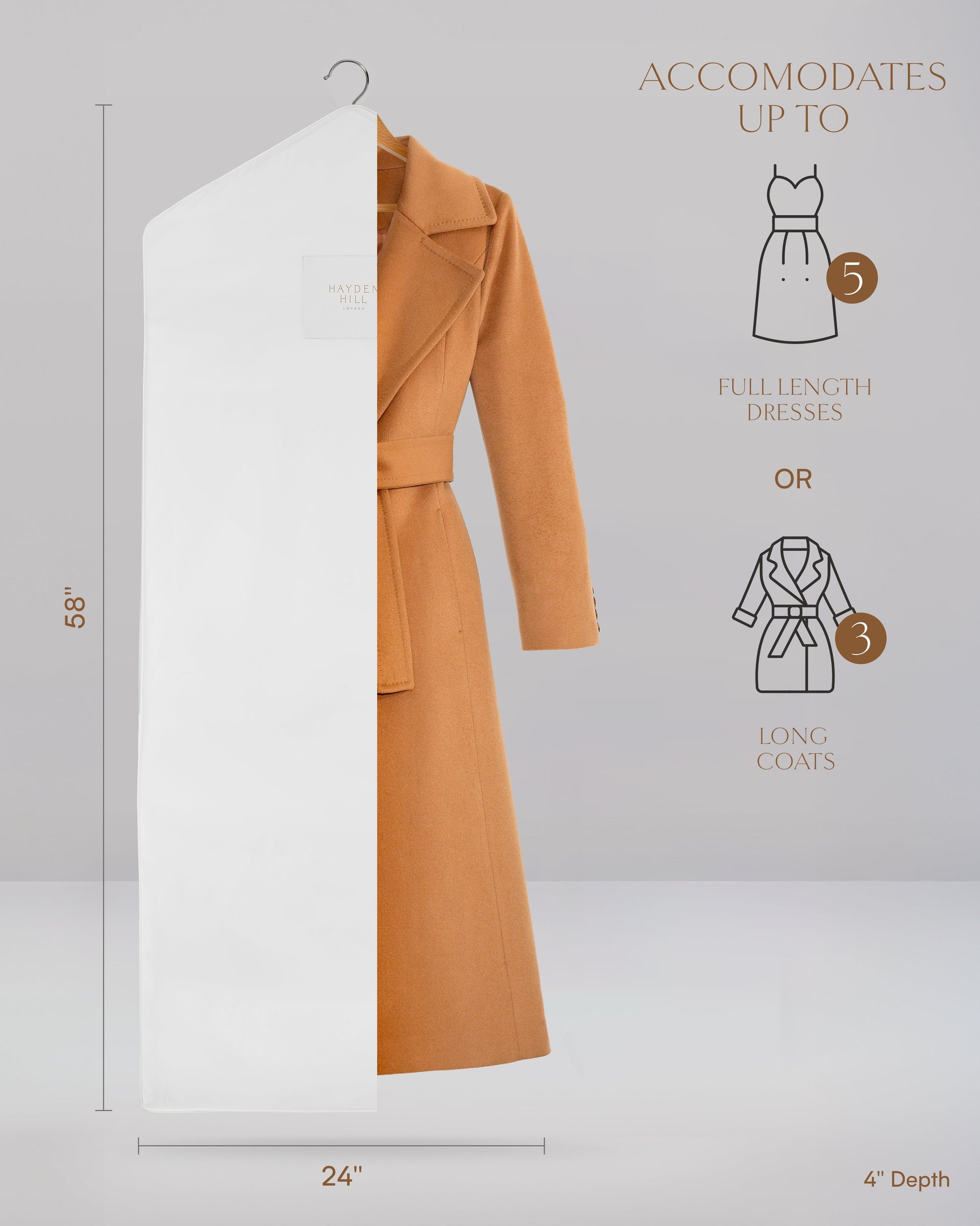 - The 58 inch drop holds up to five full length dresses or three coats, depending on thickness