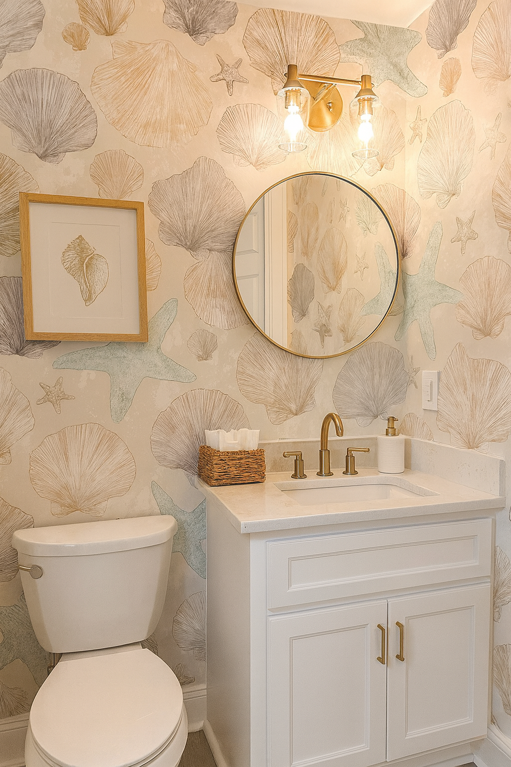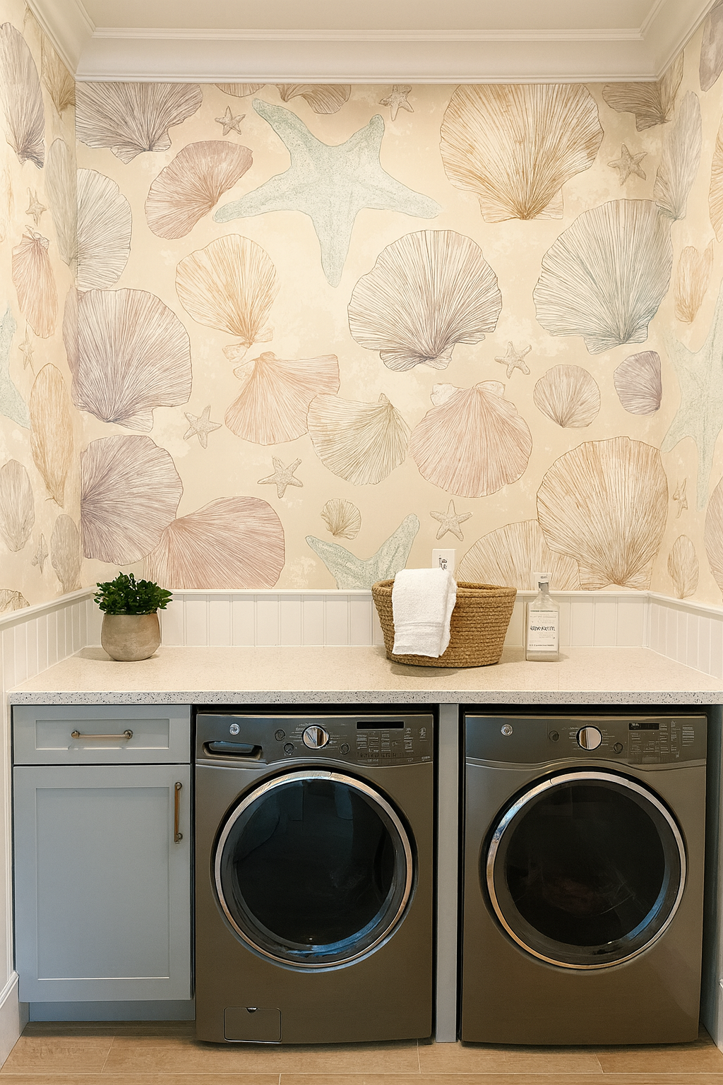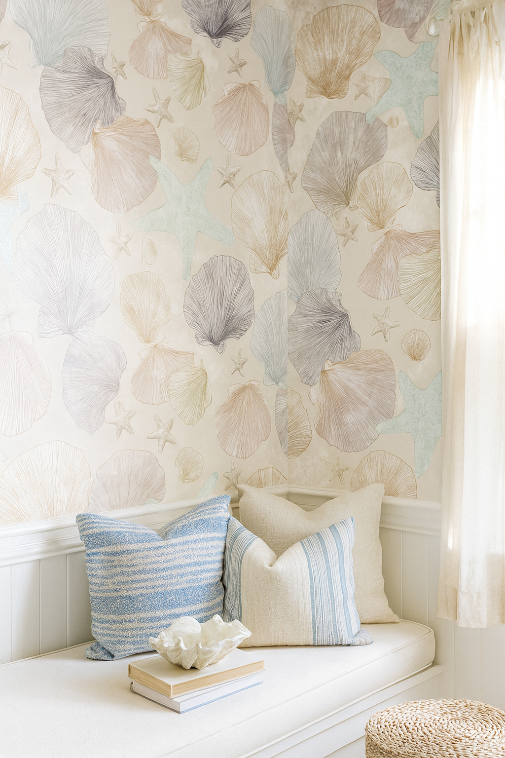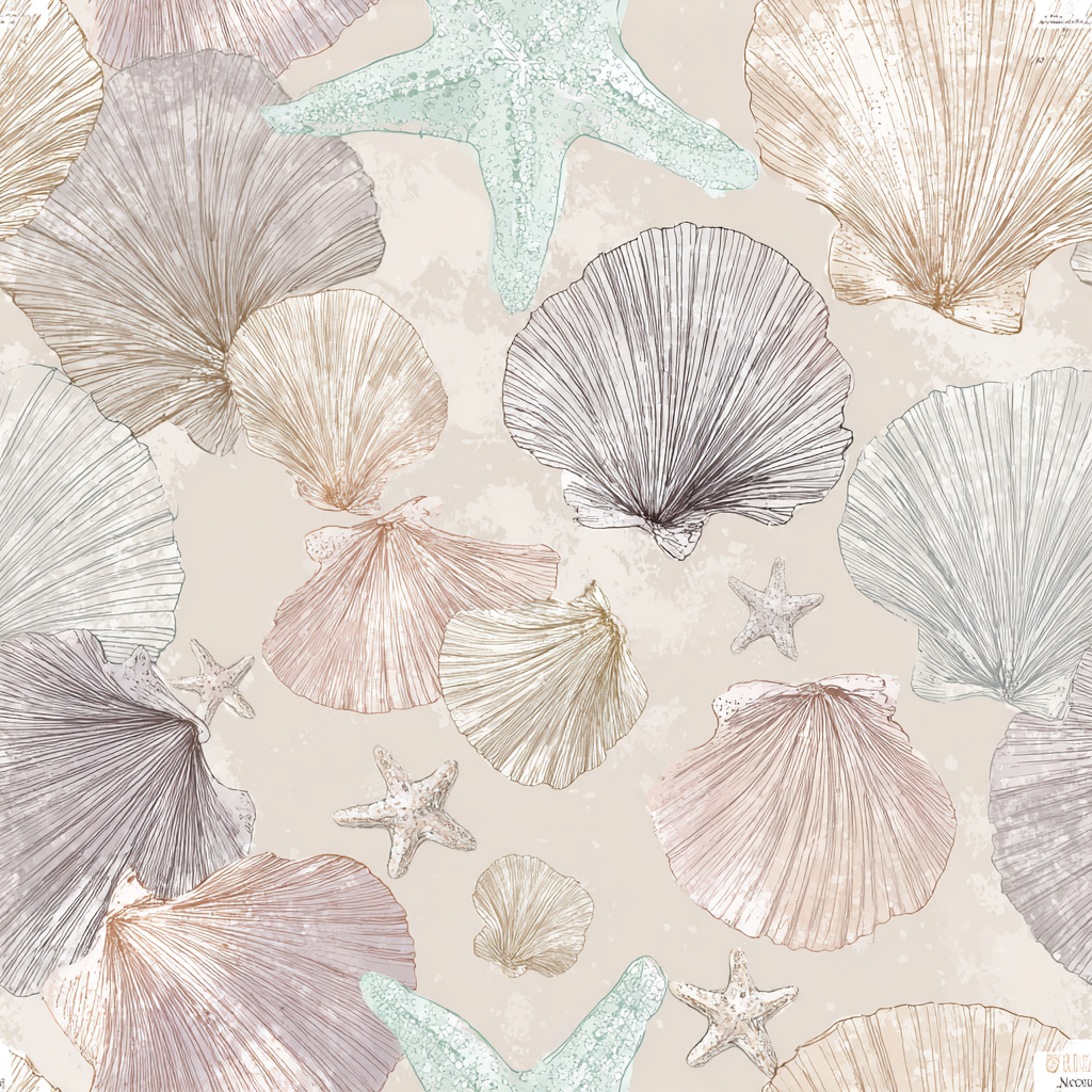A soft and calming coastal pattern that feels like beachcombing at low tide. Meticulously hand-drawn scallop shells, starfish, and sand-worn textures float across a sandy beige backdrop, rendered in a palette of chalky mauves, misty greys, driftwood browns, and a whisper of seafoam. The design has a quiet sophistication that leans more Hamptons coastal than nautical cliché. Ideal for high-end bathroom wallpaper, beach house upholstery, or calming spa textiles.