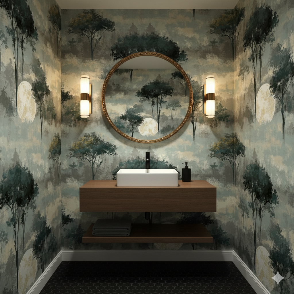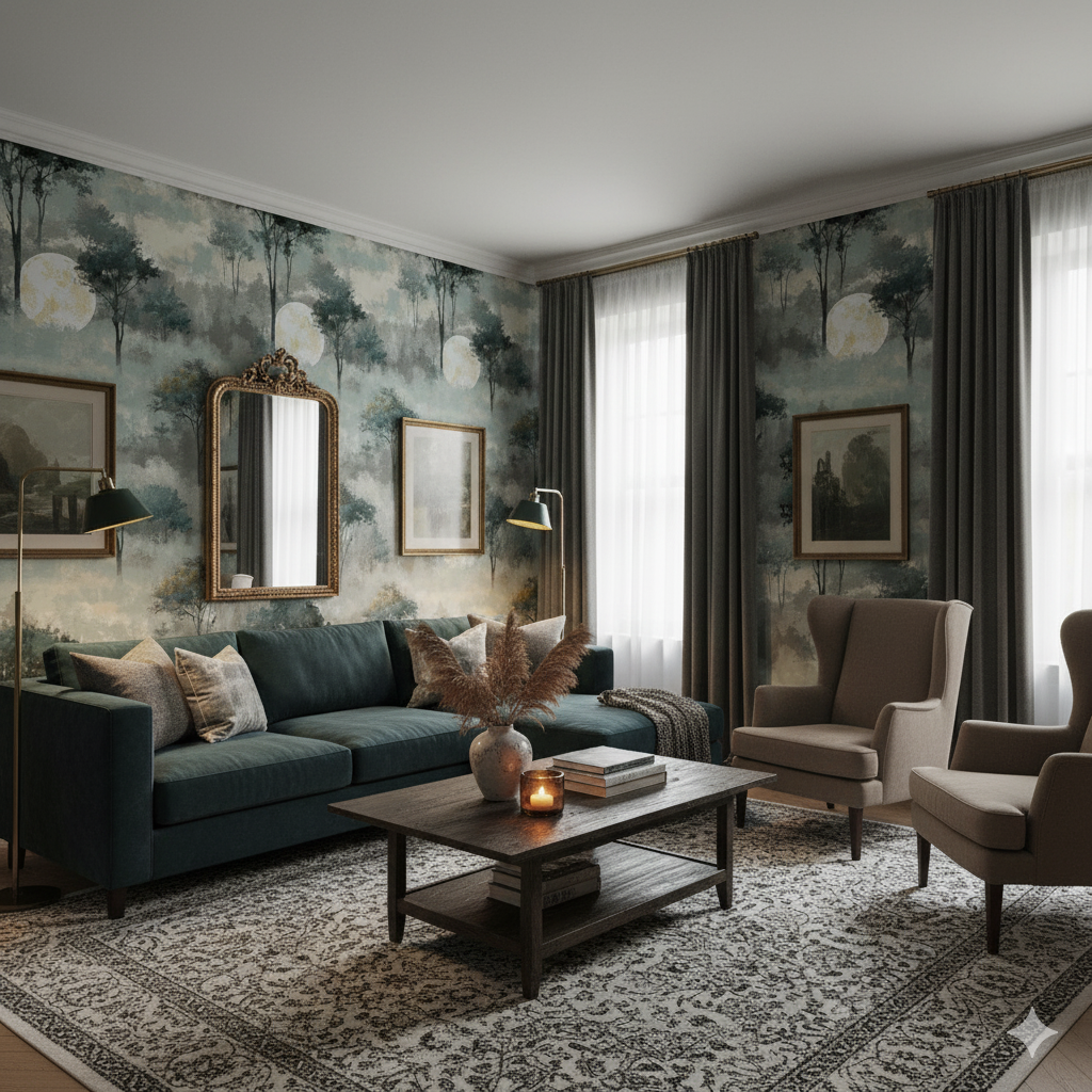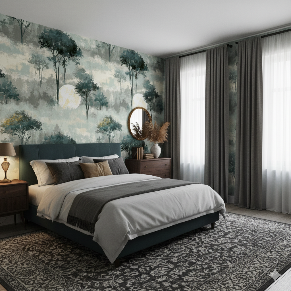 A glowing full moon hovers behind tall, silhouetted trees rising through a haze of silver-green and muted gray. The design has a dreamy, ethereal quality — the forest receding into mist, bathed in the light of a celestial lantern. Subtle golden tones in the moon add warmth against the cool woodland palette. This mural-like pattern would be striking in a bedroom, spa, or meditation space, where tranquility and a connection to nature are desired. Its painterly brushwork softens the otherwise bold imagery, blending realism with artistic abstraction.
