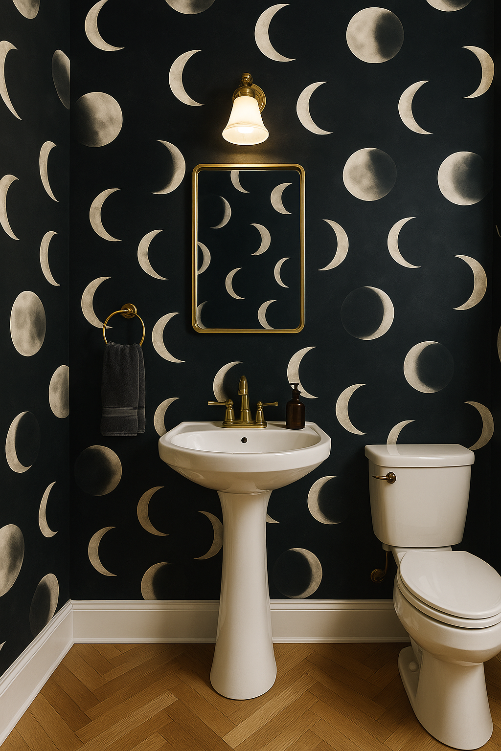 Lunar Veil Wallpaper evokes celestial magic with delicate phases of the moon rendered in soft silver and ivory on a deep indigo background. Perfect for bedrooms, meditation spaces, or moody powder rooms, this cosmic design speaks to those seeking lunar wallpaper, celestial wall coverings, modern astrology wallpaper, or starry night-inspired wallpaper.