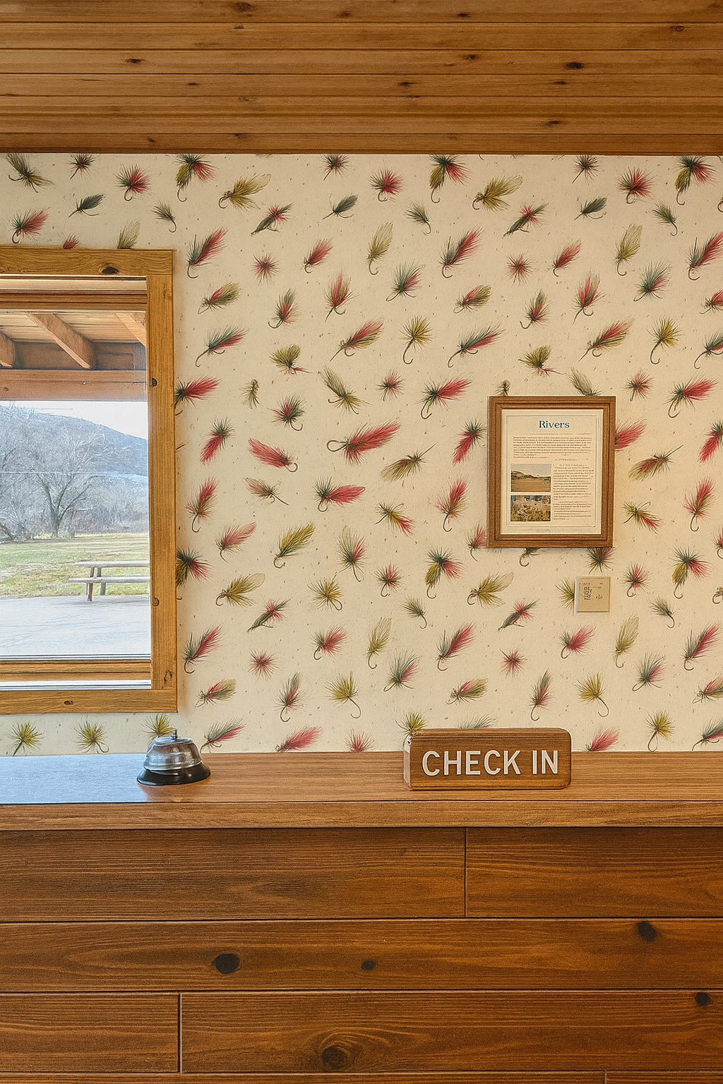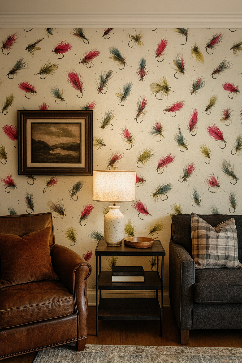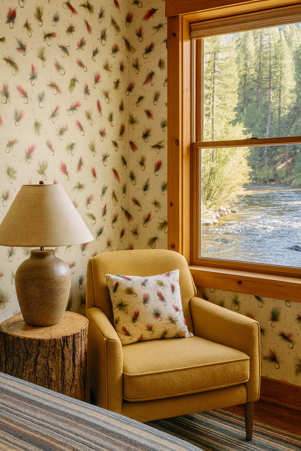 A lively homage to vintage fly fishing, this pattern features detailed illustrations of classic fishing flies in vivid crimsons, olive greens, charcoal blacks, and steely blues. Scattered playfully on a warm ivory backdrop, the design offers movement and whimsy with a nostalgic outdoorsman’s flair. It’s a perfect fit for a fly shop, cabin mudroom, or eclectic powder room. Bold yet tasteful, it hooks just the right amount of attention.
