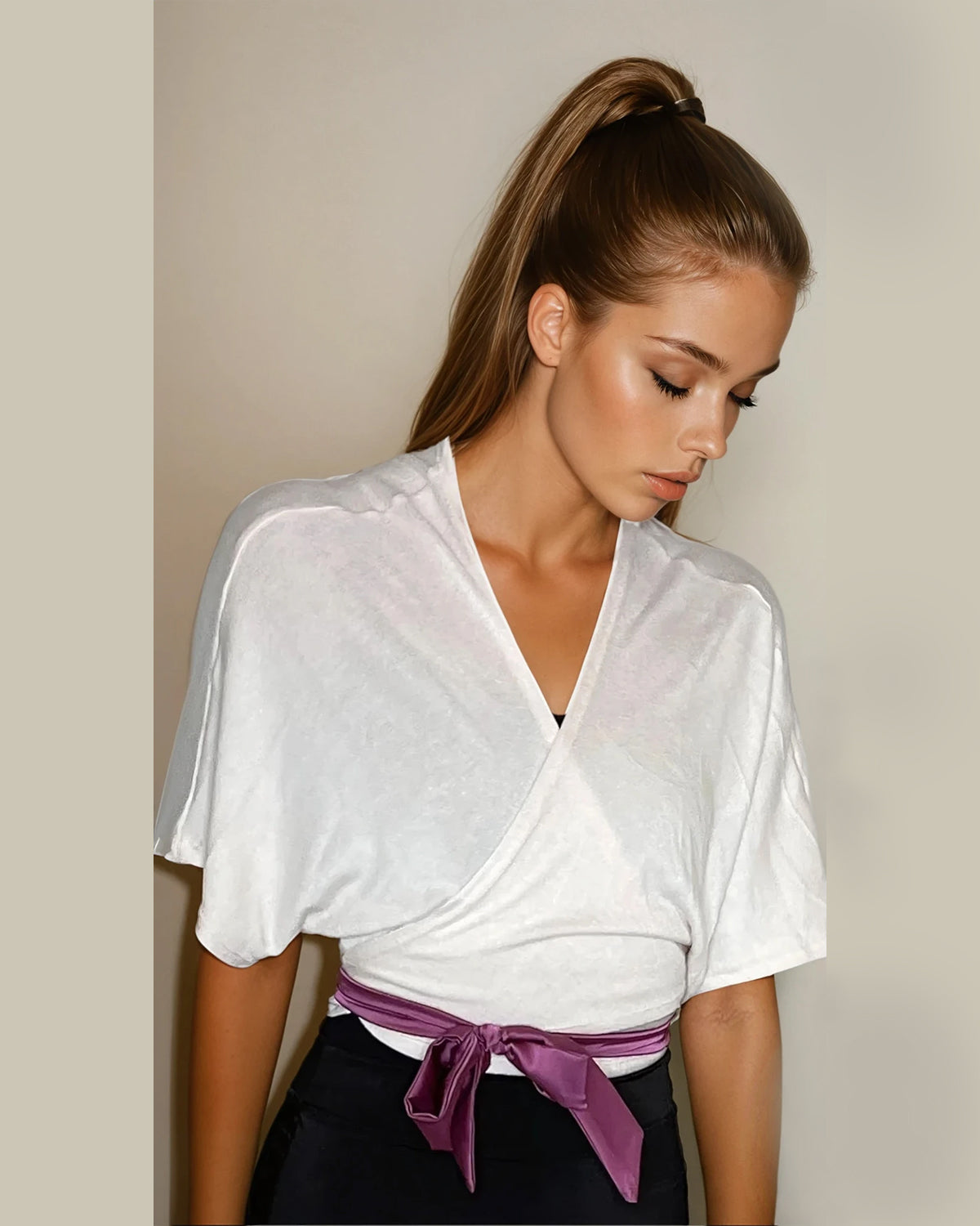 Featuring a cropped silhouette and graceful Kimono-style sleeves, this wrap top is expertly crafted from the finest, ultra-soft sweater knit fabric. Its composition includes a harmonious blend of silky rayon, breathable cotton, and moisture-wicking modal, ensuring you'll be reluctant to part with it.