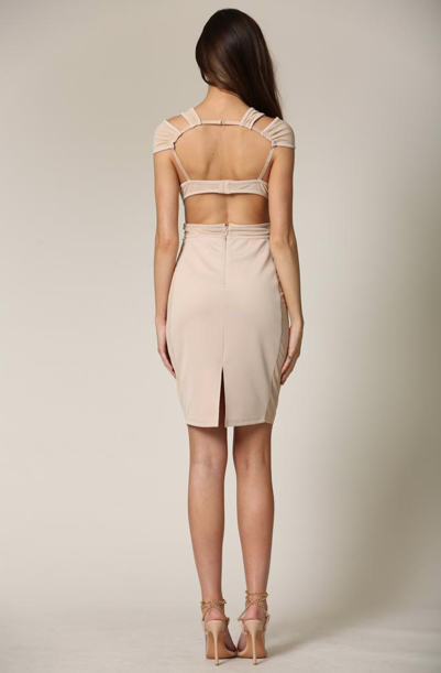 A dress featuring cut out shoulders and neckline. It capped off the shoulders giving you a flirtatious silhouette. The cut out waist makes it the ultimate show stopper with a mesh panel, hook and back zip closure. In addition it has a back leg slit ending in finished hem all around.