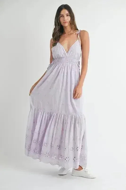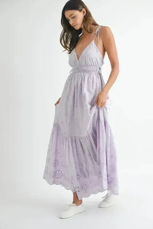 The eyelet lace maxi dress with side strap details is an elegant and sophisticated choice for a formal occasion. The intricate eyelet lace design adds a touch of glamour, while the side strap details provide a modern and unique twist to the classic maxi dress silhouette. Pair with heels and minimal jewelry for a stunning and standout ensemble that exudes timeless beauty.