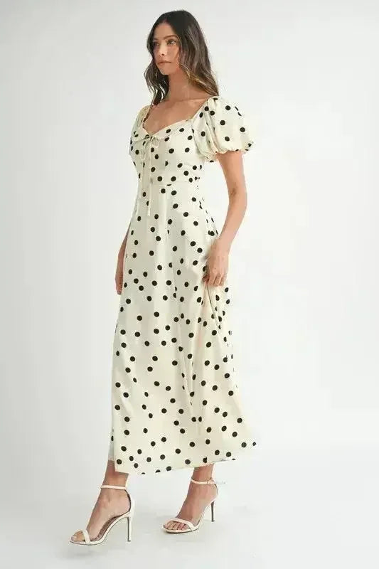 The polka dot puff sleeve midi dress is a timeless and charming option for a classic outfit. The polka dot pattern adds a playful and retro touch to the dress, while the puff sleeves bring a flattering and stylish silhouette. Perfect for a variety of occasions, this dress exudes a sweet and feminine vibe that will never go out of style. Pair it with heels or flats for a versatile and chic ensemble that captures a nostalgic elegance.