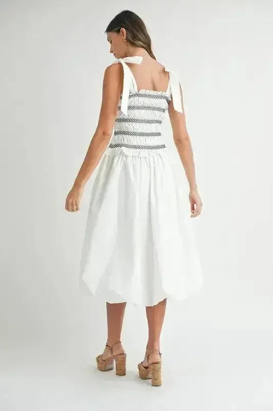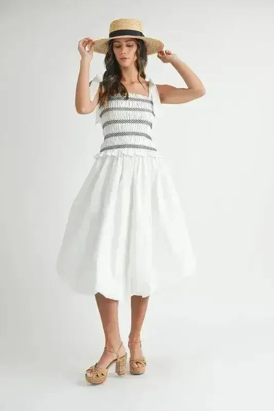 A smocked bodice bubble midi dress is a cute and stylish option for a casual yet chic look. The smocked bodice provides a comfortable and flattering fit, while the bubble midi skirt adds a playful and trendy touch. This dress is perfect for various occasions, from brunch dates to summer outings. Pair it with sandals or sneakers for a relaxed vibe, or dress it up with heels and accessories for a more polished ensemble. Enjoy the comfort and fashion-forward style of this trendy midi dress!
