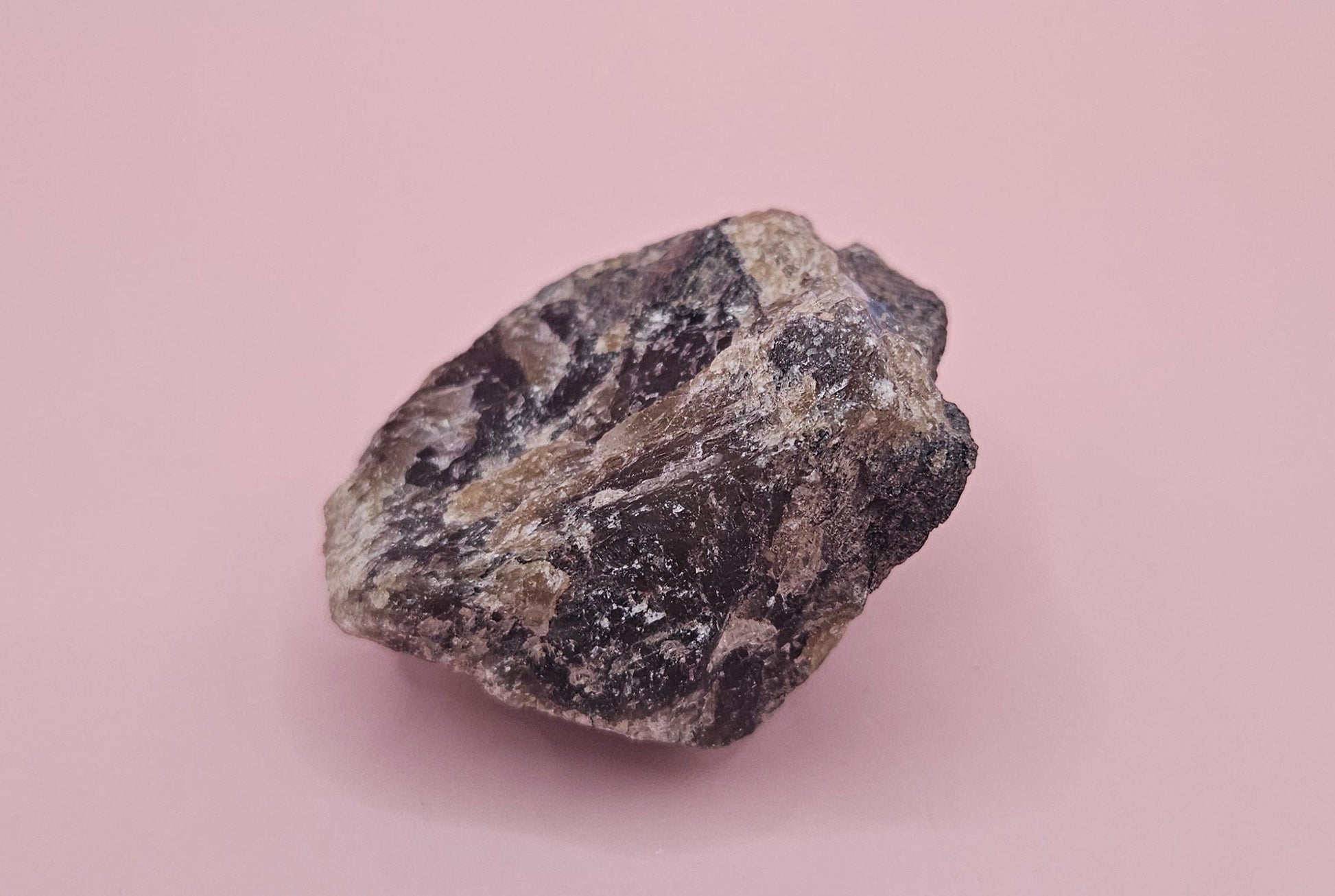 Color: Earthy gray and tan matrix with subtle iridescent flashes of blue and green