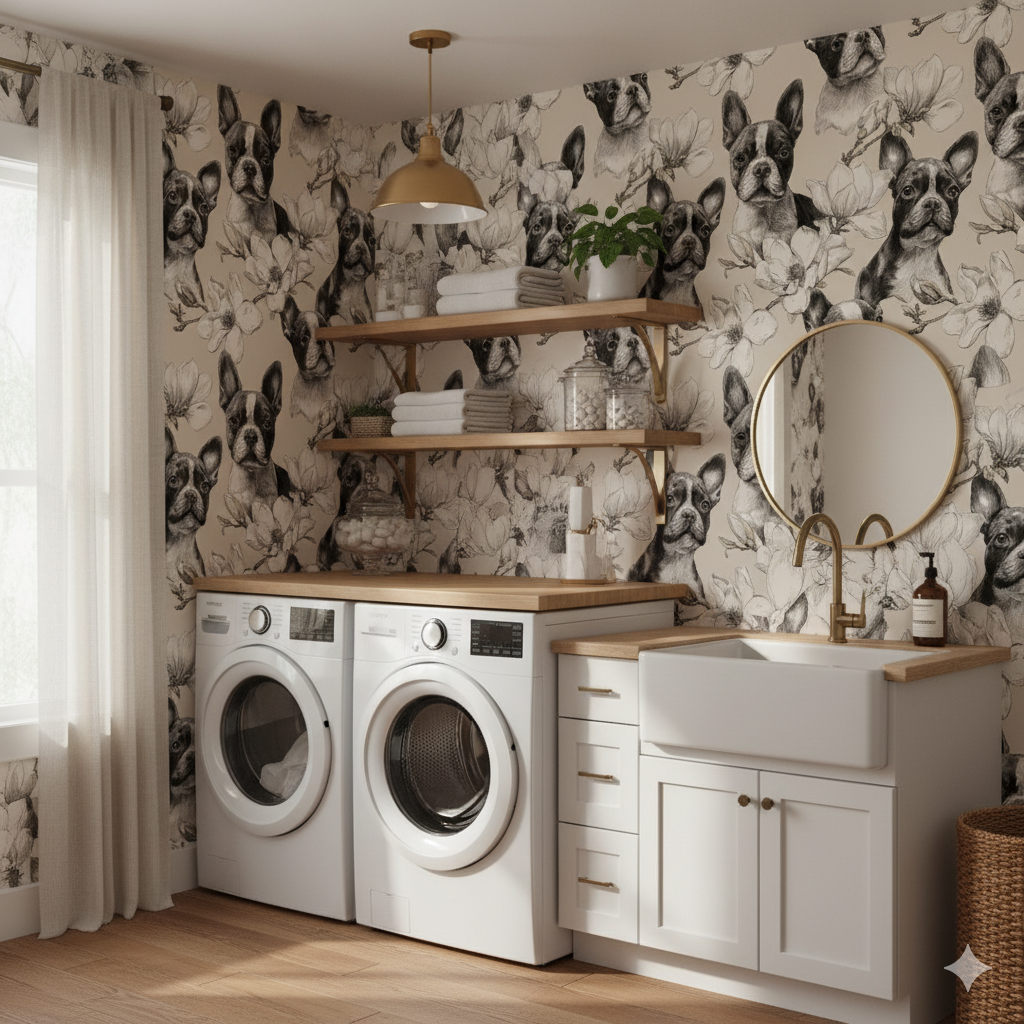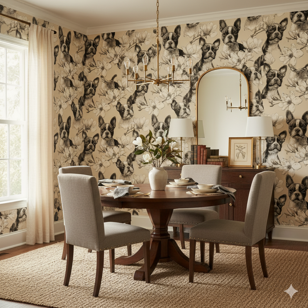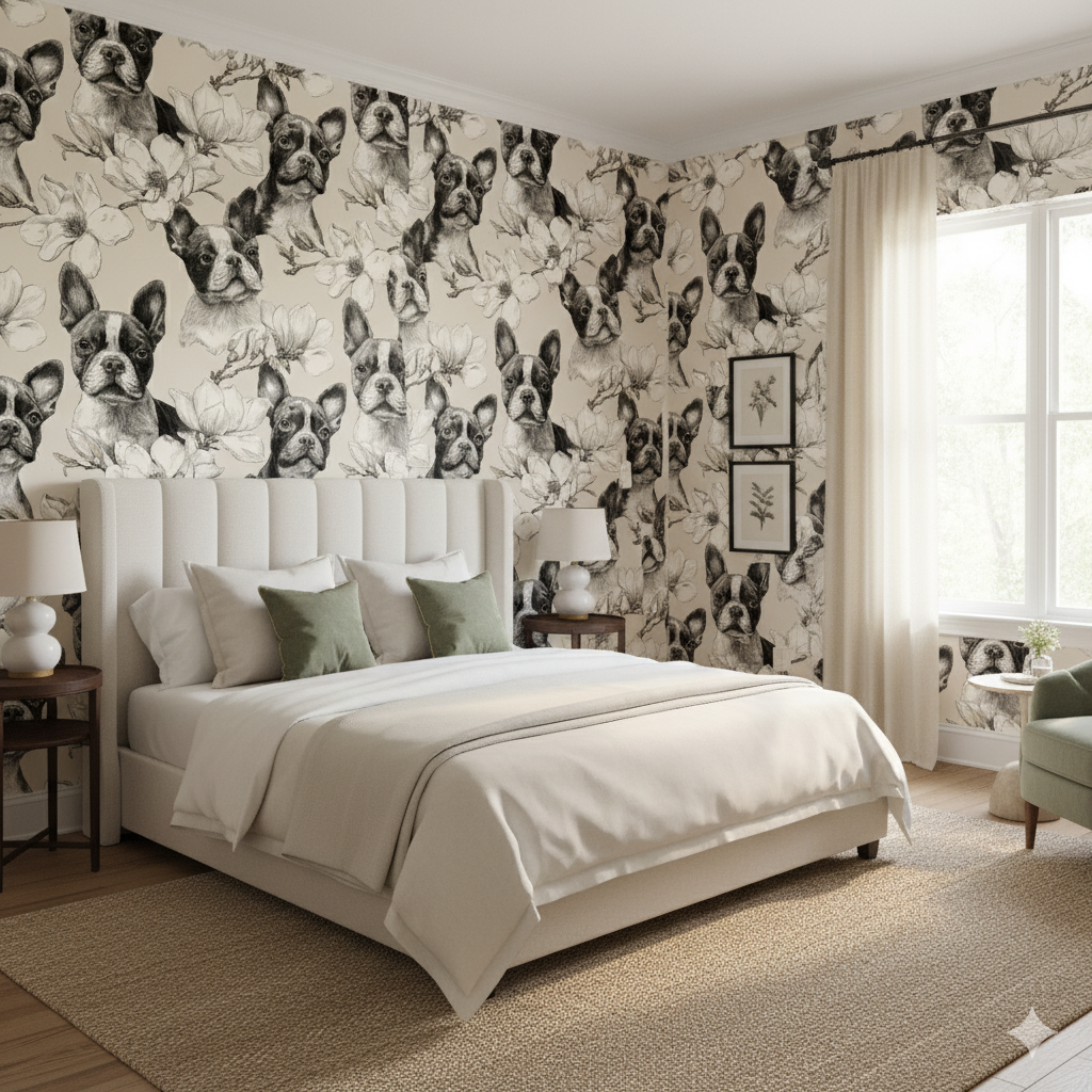 In striking black ink linework against a warm beige ground, Boston terriers are framed by blooming magnolia branches. The hand-drawn detailing gives a timeless, engraving-like quality, creating a look that feels both vintage and modern. The monochrome palette is accented by subtle shading in the florals, making it versatile for sophisticated interiors, from urban apartments to pet-friendly offices. This wallpaper is ideal for someone who appreciates detailed illustration with a quirky twist, bridging the gap between fine art and personal charm. Strong SEO hooks would include "Boston terrier wallpaper," "sketched magnolia wall mural," and "black and white dog wallpaper."