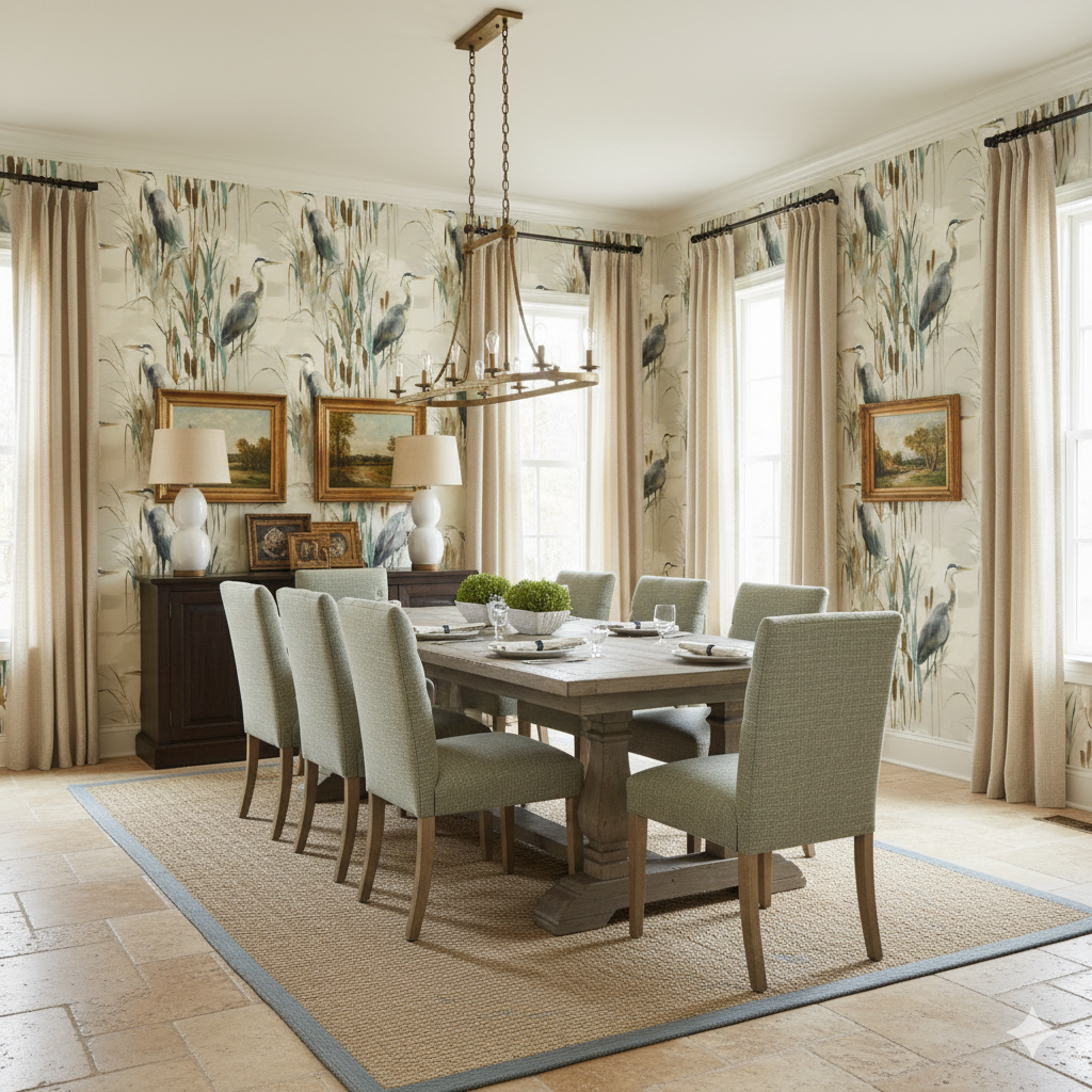 This wallpaper captures the quiet dignity of herons standing tall among cattails and reeds, their slate-gray feathers accented with muted washes of cream and indigo. The composition feels like a painter’s field sketch, translating wetland stillness into a soft, meditative pattern. The earthy palette of tan, sienna, and weathered green makes it easy to pair with organic textures like linen, rattan, or reclaimed wood. It’s a natural fit for lake houses, breakfast nooks, or offices where you want a steadying, contemplative presence—spaces that thrive on balance between water, land, and air.