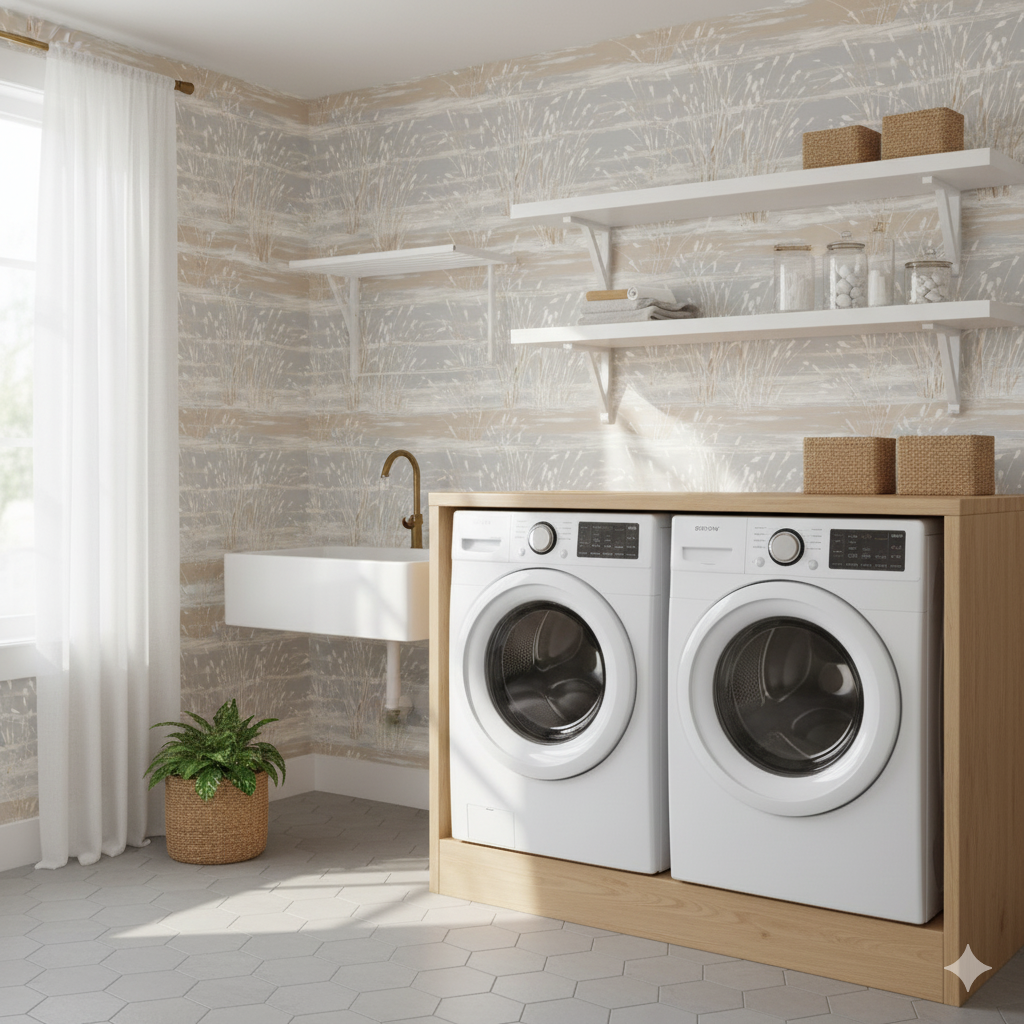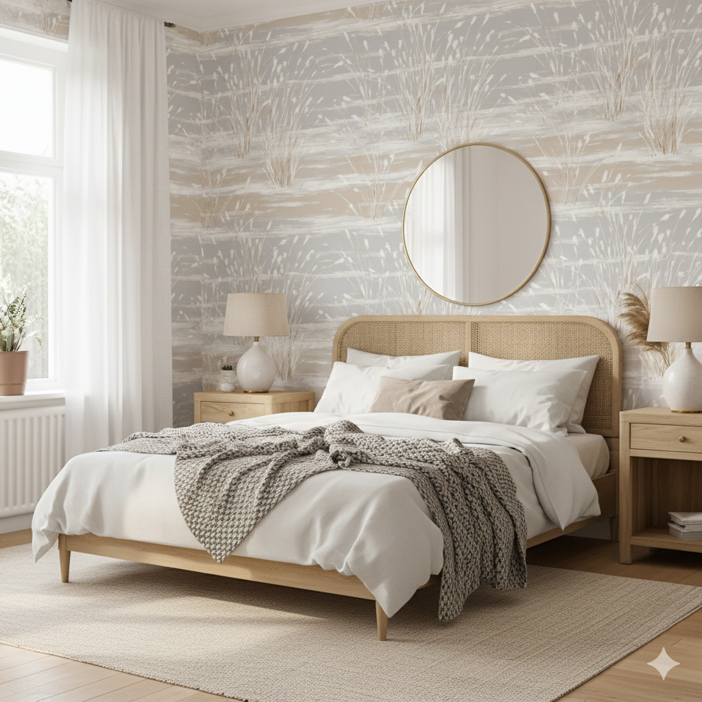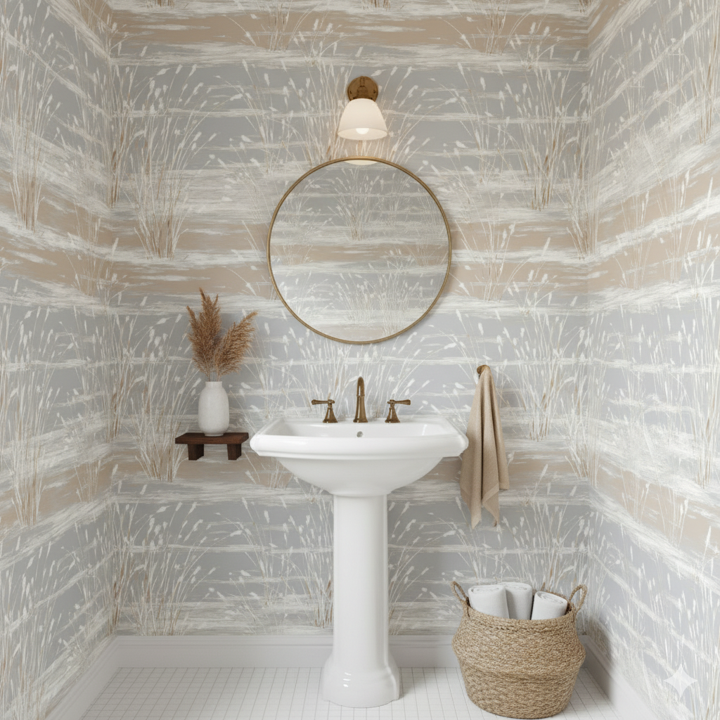 Airy and understated, this wallpaper depicts windswept dune grasses swaying across a neutral field of beige, taupe, and misty gray. The fine linear strokes create movement and delicacy, while the overall palette remains soft and muted, perfect for serene interiors. Marshland Whisper feels light and expansive, almost like a soft pencil sketch over washed paper, making it versatile for bedrooms, reading nooks, and calm, Scandinavian-inspired living rooms. Its natural elegance also works beautifully in coastal cottages or spa-inspired bathrooms, where subtle organic patterns help promote tranquility and ease.