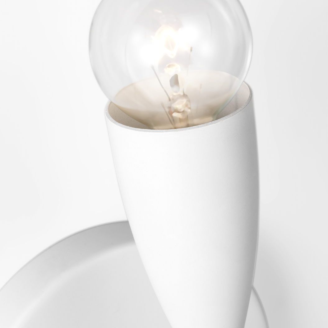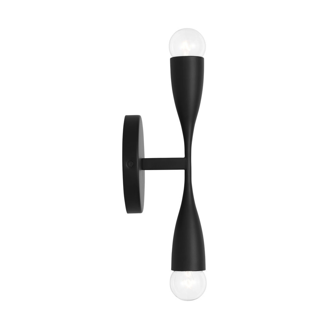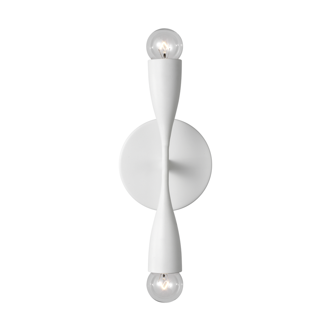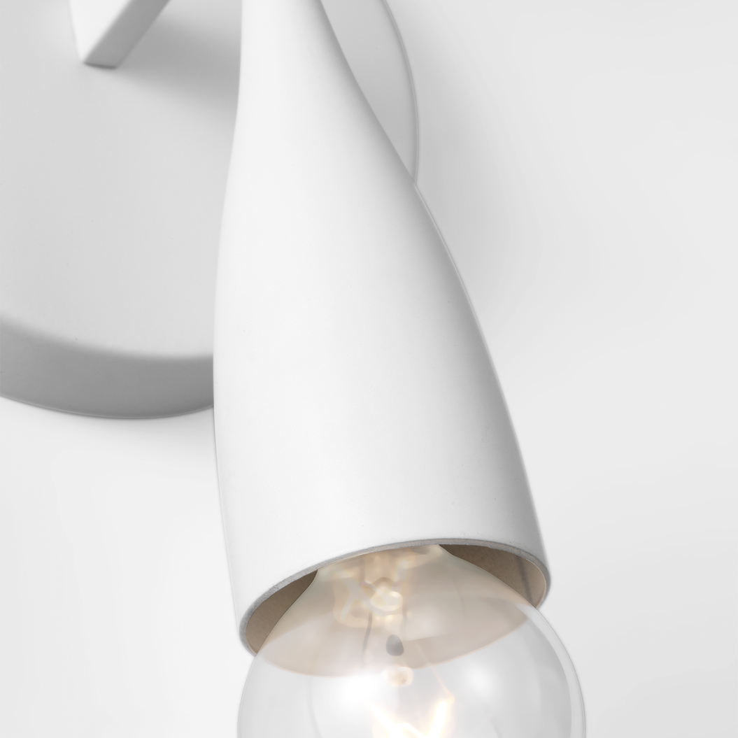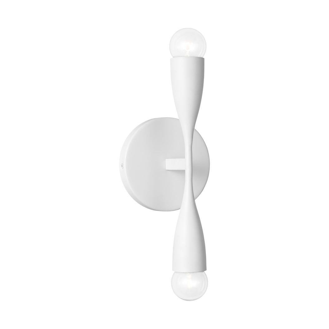 The Maya Small Bath stacks two exposed lamps along a vertical axis, each held by a slender, tapered metal form. Mounted to a circular backplate, the fixture delivers bi-directional illumination while preserving the sculptural silhouette of the series. Suitable for flanking mirrors, narrow walls, or transitional hallway placements.