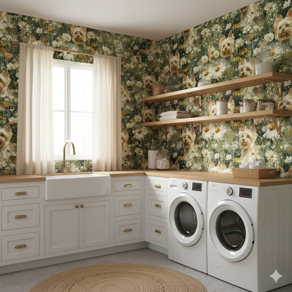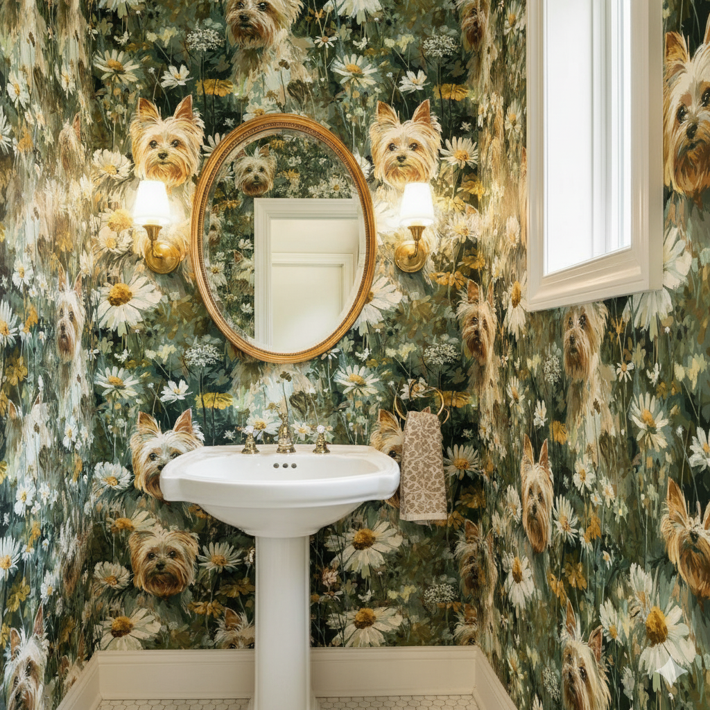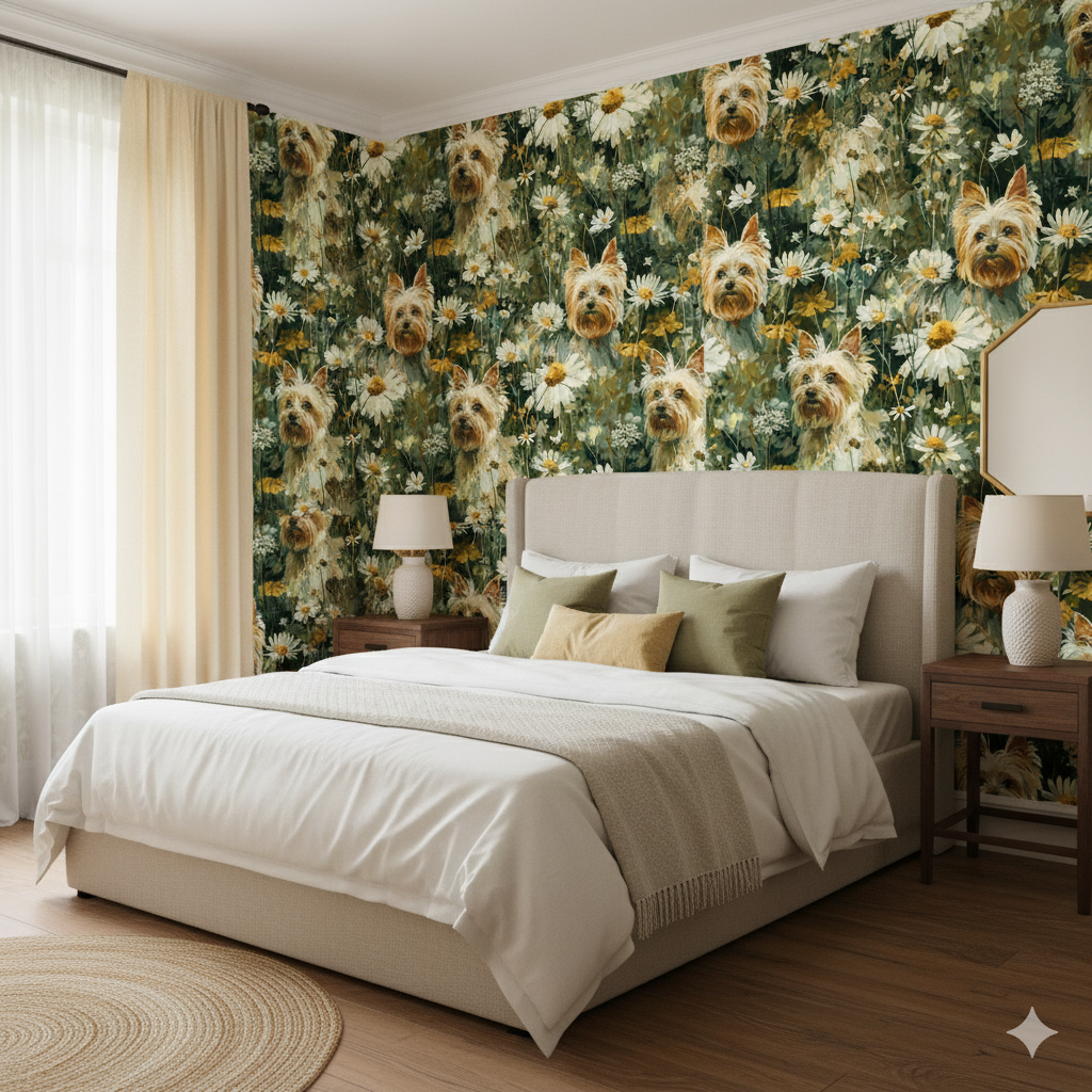 This whimsical wallpaper places Yorkshire terriers in a lively meadow of daisies, buttercups, and wildflowers. The painterly strokes, rich in olive greens, whites, and golden yellows, create the impression of a lush summer field. The Yorkies peek out playfully among the blossoms, making this pattern ideal for informal family rooms, playrooms, or even pet grooming spaces. It balances a playful energy with pastoral charm, reminiscent of countryside walks and wildflower fields. Search terms like "Yorkie wallpaper," "meadow floral wallpaper with dogs," and "cottage wildflower wall décor" fit seamlessly.